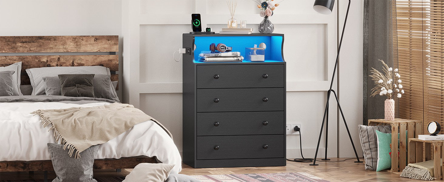 Hasuit | 27.6 Inch Black Dresser with Charging Station 4 Drawers LED Dresser for Bedroom with Open Space