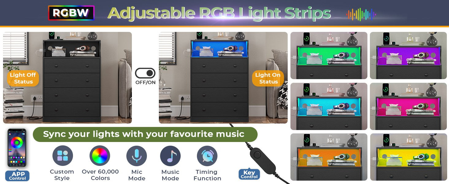 •【Dresser with RGB LED Lights】LED lights make drawer dresser looks prettier in the dark and adds a unique vibe to your bedroom. The LED lights can be controlled by remote control or APP. It has more than 60,000 colors to choose from, the brightness can be adjusted, and there are many other modes waiting for you to explore: custom style mode, music mode, mic mode and timing function.
