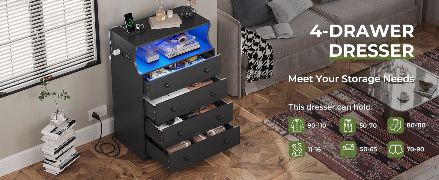 4 Drawer Dresser with LED Lights and Built-in Power Outlets