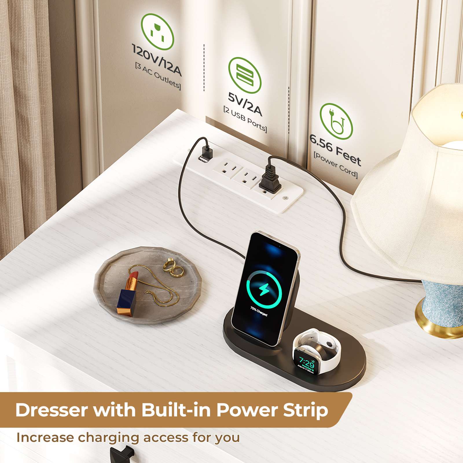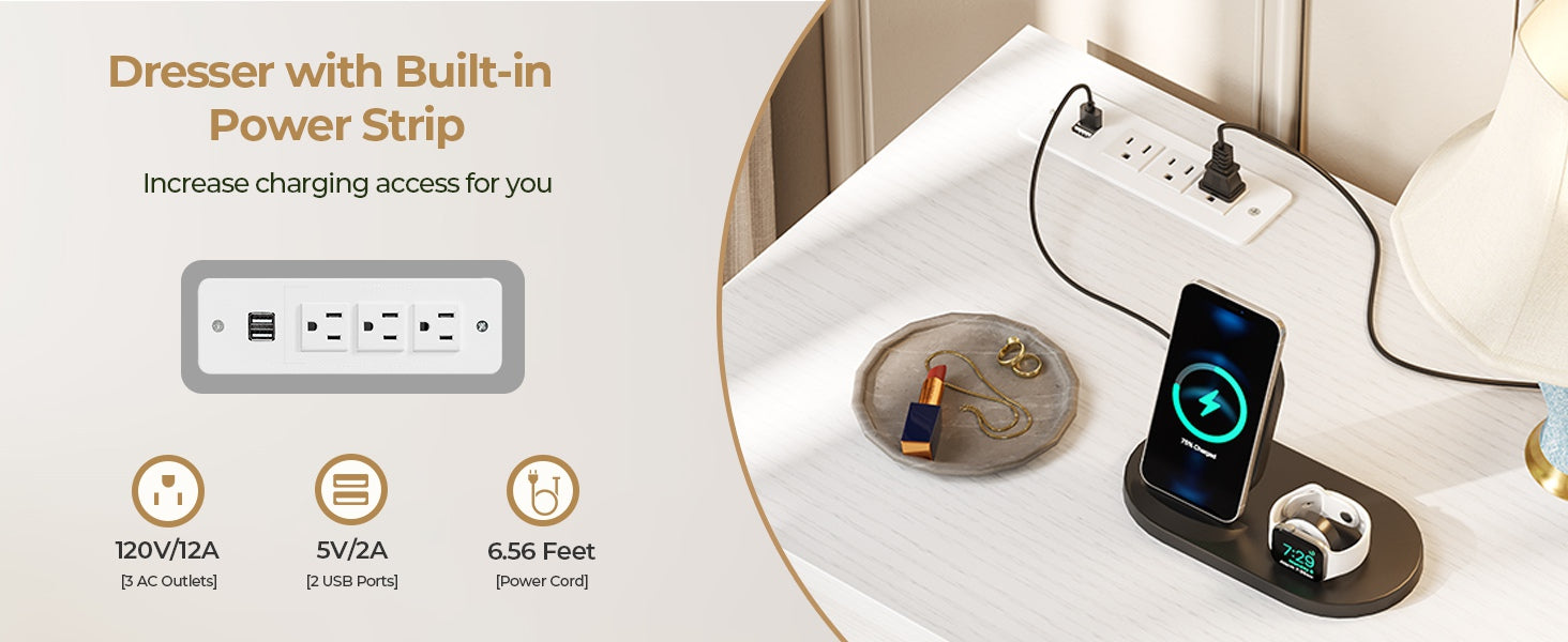 •【Built-in Power Outlets for Easy Use】This large wooden dresser is equipped with built-in power outlets, including 3 AC outlets and 2 USB ports, which can power your electronic devices such as table lamps, mobile phones, speakers, makeup mirrors, hair dryers, etc. These ports are very convenient to use, especially when your room has limited outlets. It concentrate the wires at the back of the desktop, making it easy to organize, saving space, and keeping the home space beautiful.