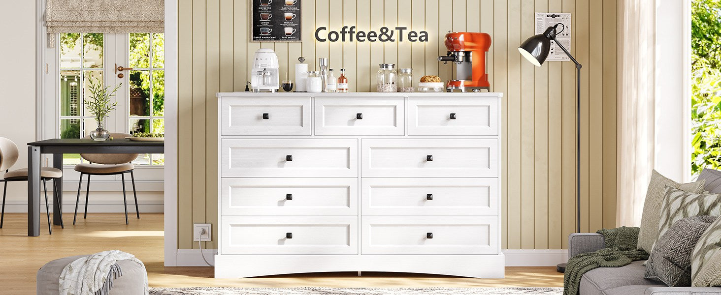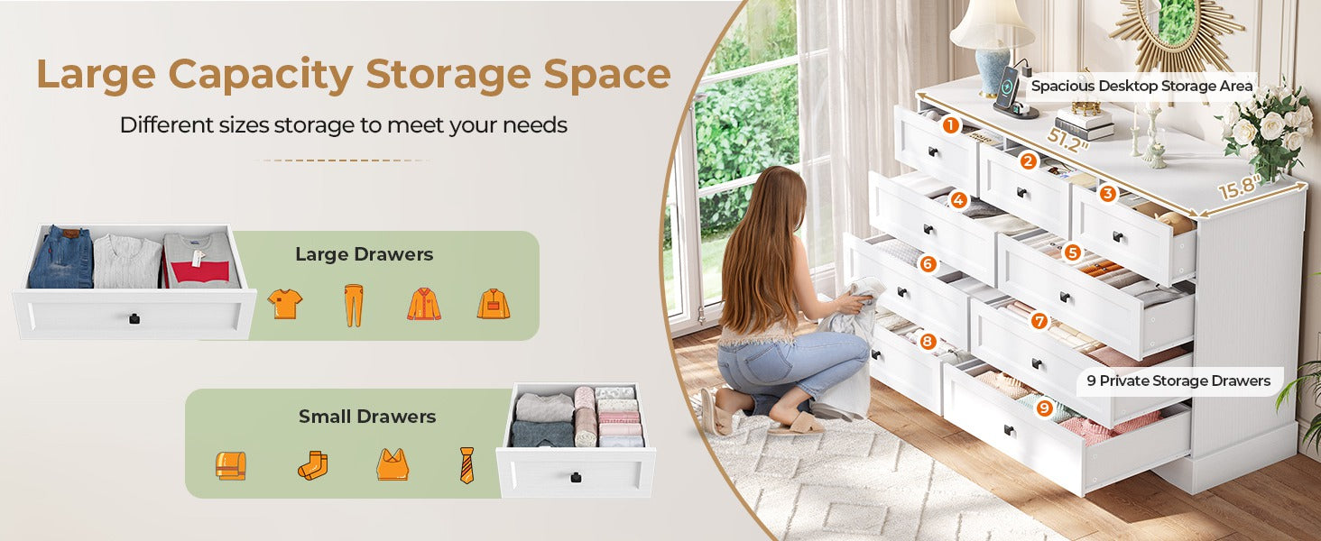 • 9 Drawers Storage: 6 large + 3 small drawers for clothes; wide tabletop doubles as TV stand or display space.