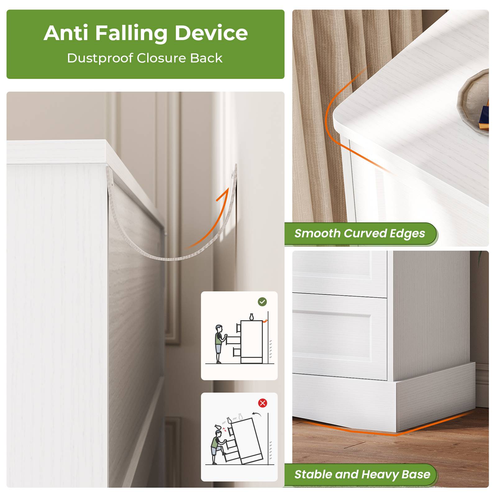 •【Durable and Stable Tall Dresser】Dressers for bedroom is made of high-quality MDF engineered wood. Hard to both flex or crack. Drawers are equipped with high-quality metal slide rails and handles, which are easy to pull and save effort. The thickened back panel ensures the privacy of your storage while enhancing stability. Anti-tip kit included to keep your family safe.The stable base design made the dresser does not slide easily, provide great durability and stability. With support legs in the middle for added weight support.