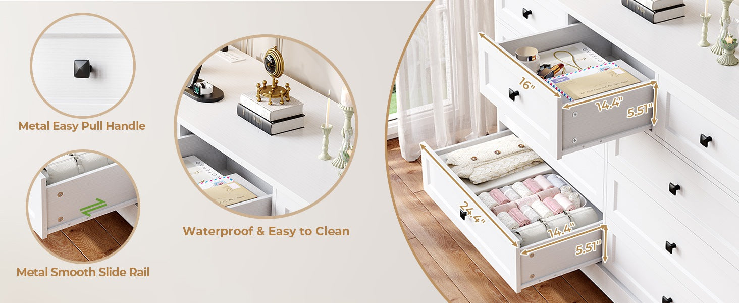 •【9 Drawers Bedroom Dresser】This white dresser for bedroom has 6 spacious large dr awers and 3 small drawers, and two different sizes of drawers can easily classify and organize your items, very suitable for small families to organize and store clothes and toys, blankets or any other personal items. The wide tabletop at the top can can be paired with a wall mounted TV as an dresser TV stand entertainment center to place audio, DVD and other equipment or display your decorations, photo frames, plants, etc. to make your room tidier.