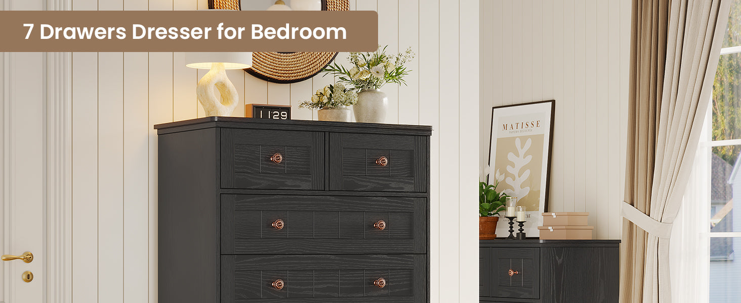 •【Tall Dresser with 7 Drawers】Dimensions: 51.4" H x 29.5" W x 15.8" D. This tall black dresser features 7 deep drawers, providing ample space for categorized storage of various items, from clothes to accessories. The wide tabletop at the top can display your decorations, photo frames, plants, etc. The large storage space meets all your storage needs and effectively keeps your room neat and organized.
