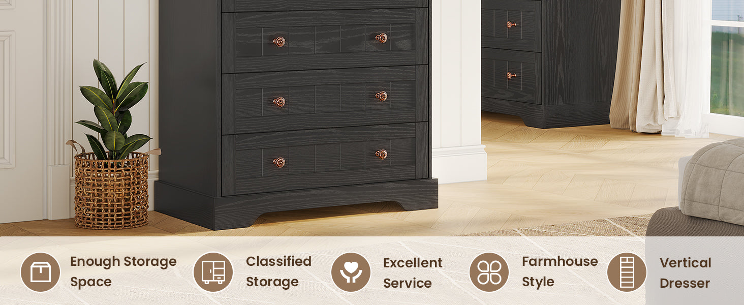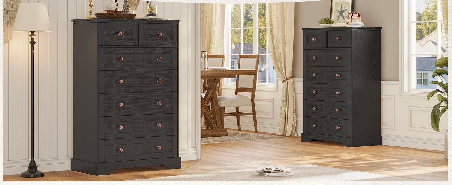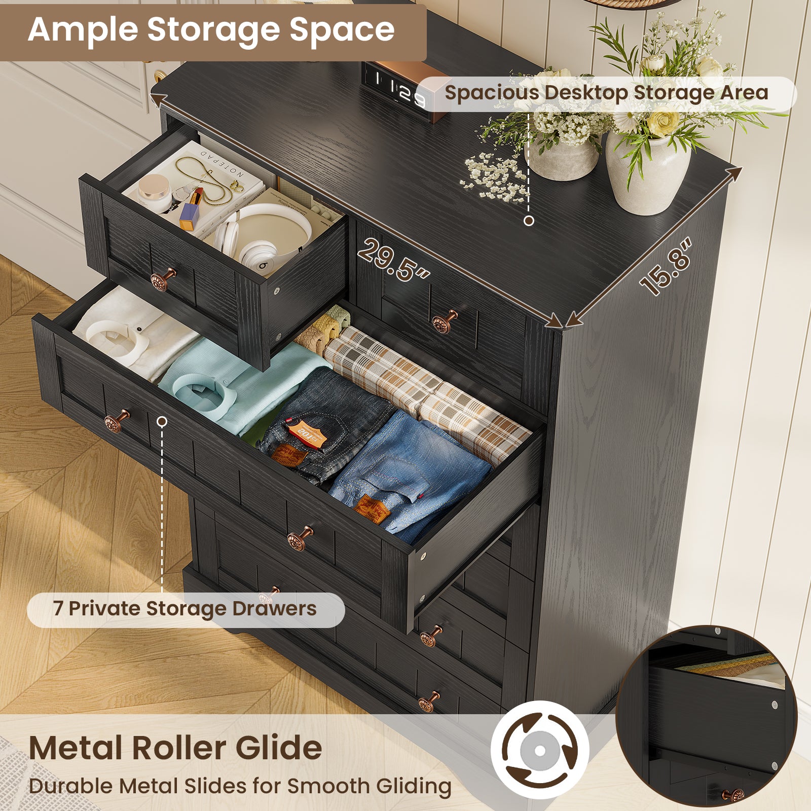 •【Large Multifunctional Dresser】This rustic-style black chest of 7 drawers offers various placement options for your room. Beyond being a storage cabinet in the bedroom, it serves as a entryway dresser to put daily items and overflow, as a baby dresser to store diapers, or as a locker in the living room for books, DVDs, decorations, etc. The classic farmhouse dressers are suitable for most styles of homes, can be integrated into different scenes, will easily meet your storage needs.