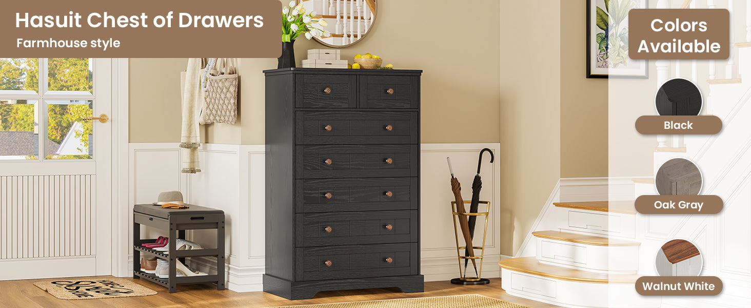 This Hasuit tall dresser exceeded my expectations. The rustic farmhouse look with embossed metal handles is stunning. All drawers slide smoothly and hold heavy items easily. The dresser feels solid and stable, and the finish is scratch-resistant and easy to clean. Great for bedrooms or even as an entryway storage solution.