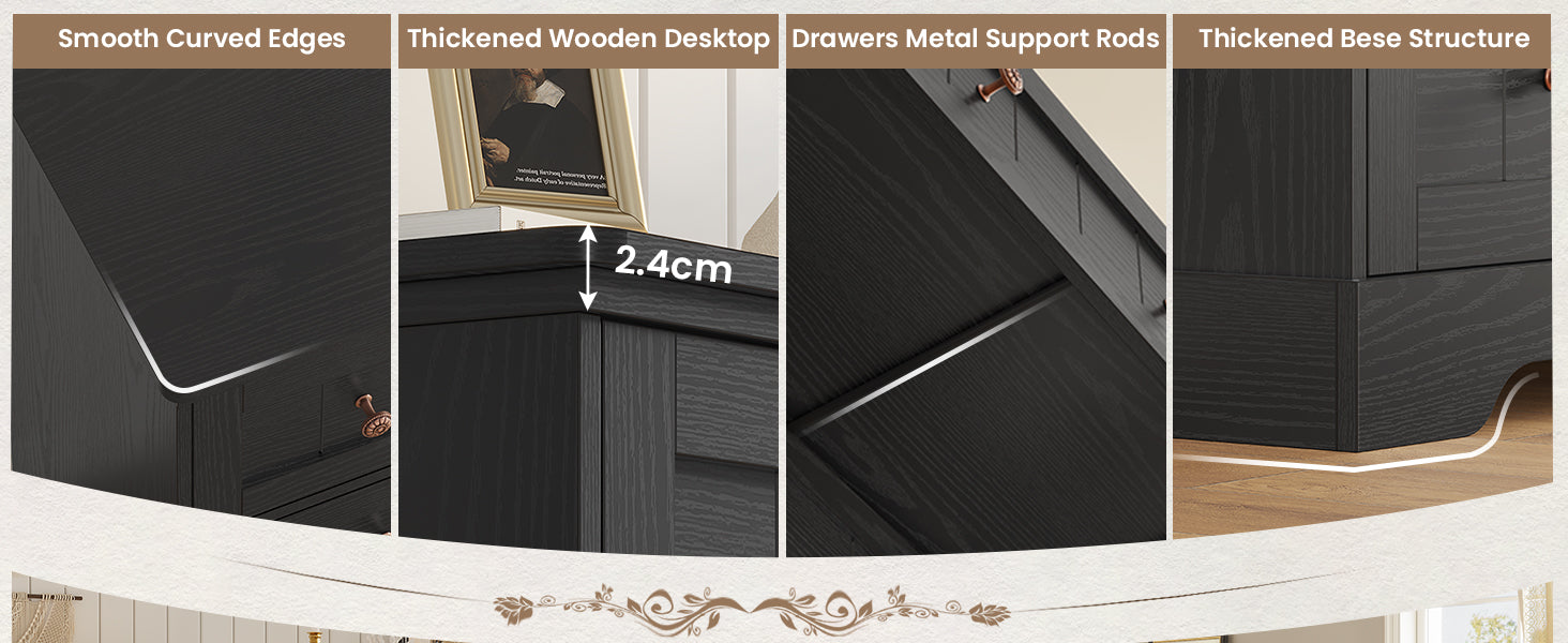 • Farmhouse Design: Hand-carved panels and embossed metal handles for rustic charm.