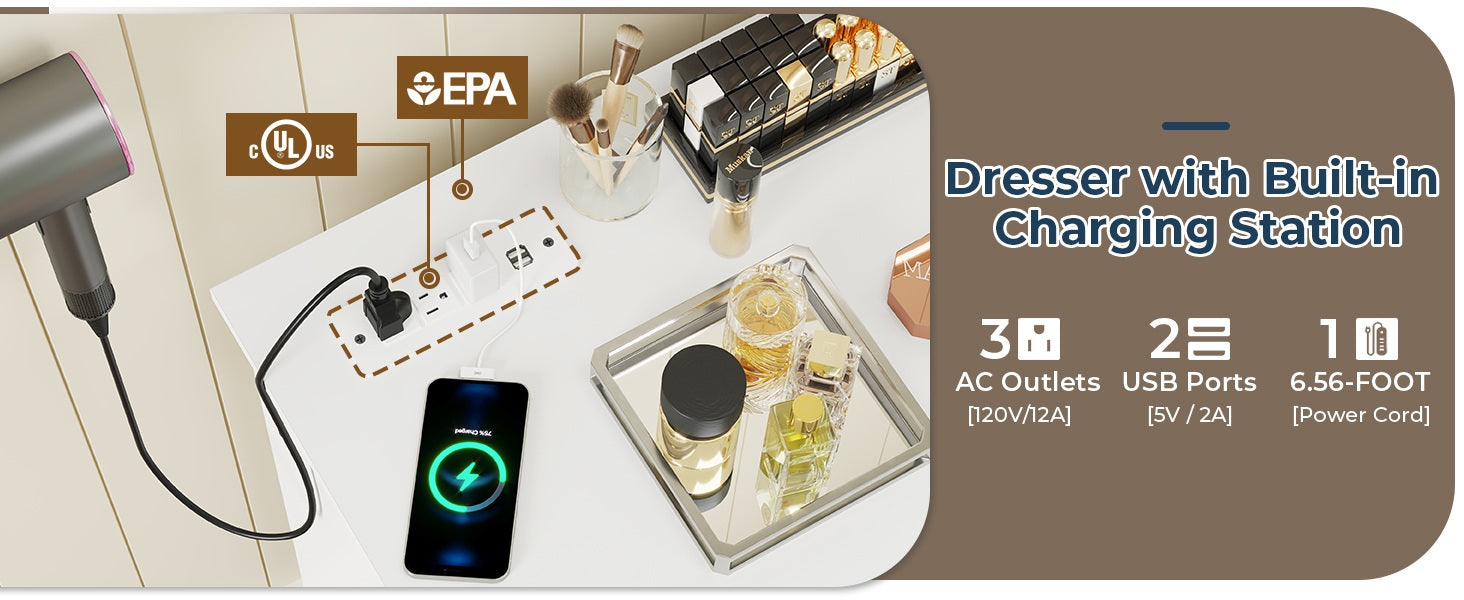 •【Built-in Charging Station】 The power strip is located on the desktop of the dresser, which has 2 AC outlets, 2 USB ports, and a power switch. It is very convenient for powering devices, such as TV, desk lamp, laptop, phone, etc.