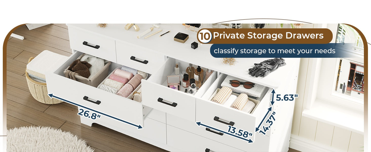 • Ample Storage: 10 drawers (6 large + 4 small) for detailed organization; 55.1"(L) x 15.7"(D) x 32.3"(H).
