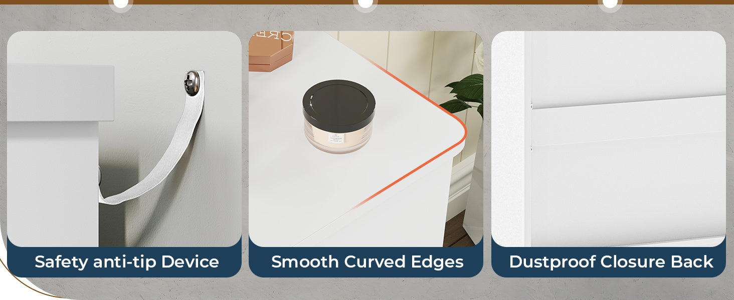 •【Enclosed Backboard】 The innovatively designed back provides the dresser with better seal and dust resistance, as well as improved stability and resistance to swaying. A cable hole on each side ensures that plugs, light strips, or other media cables are well organized.