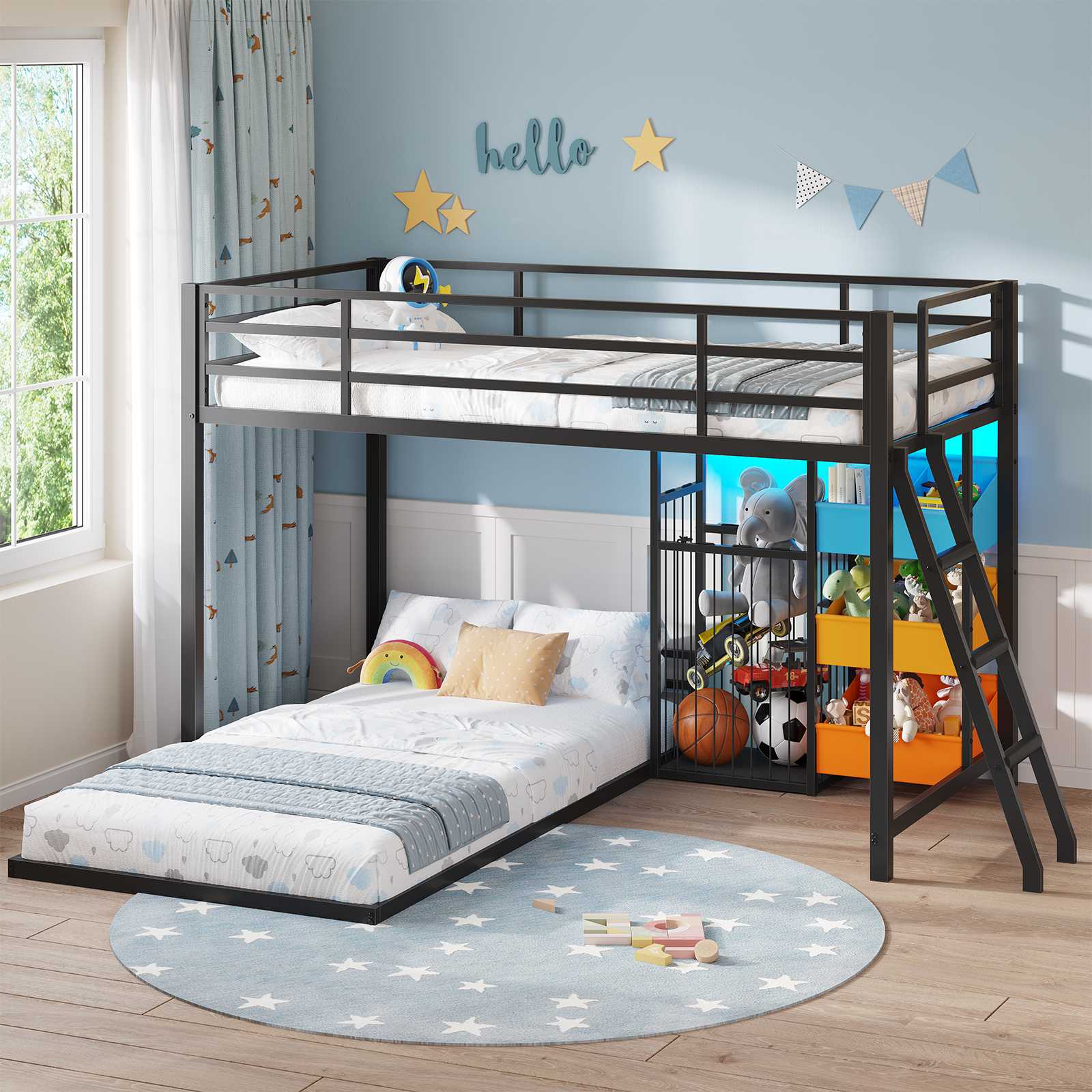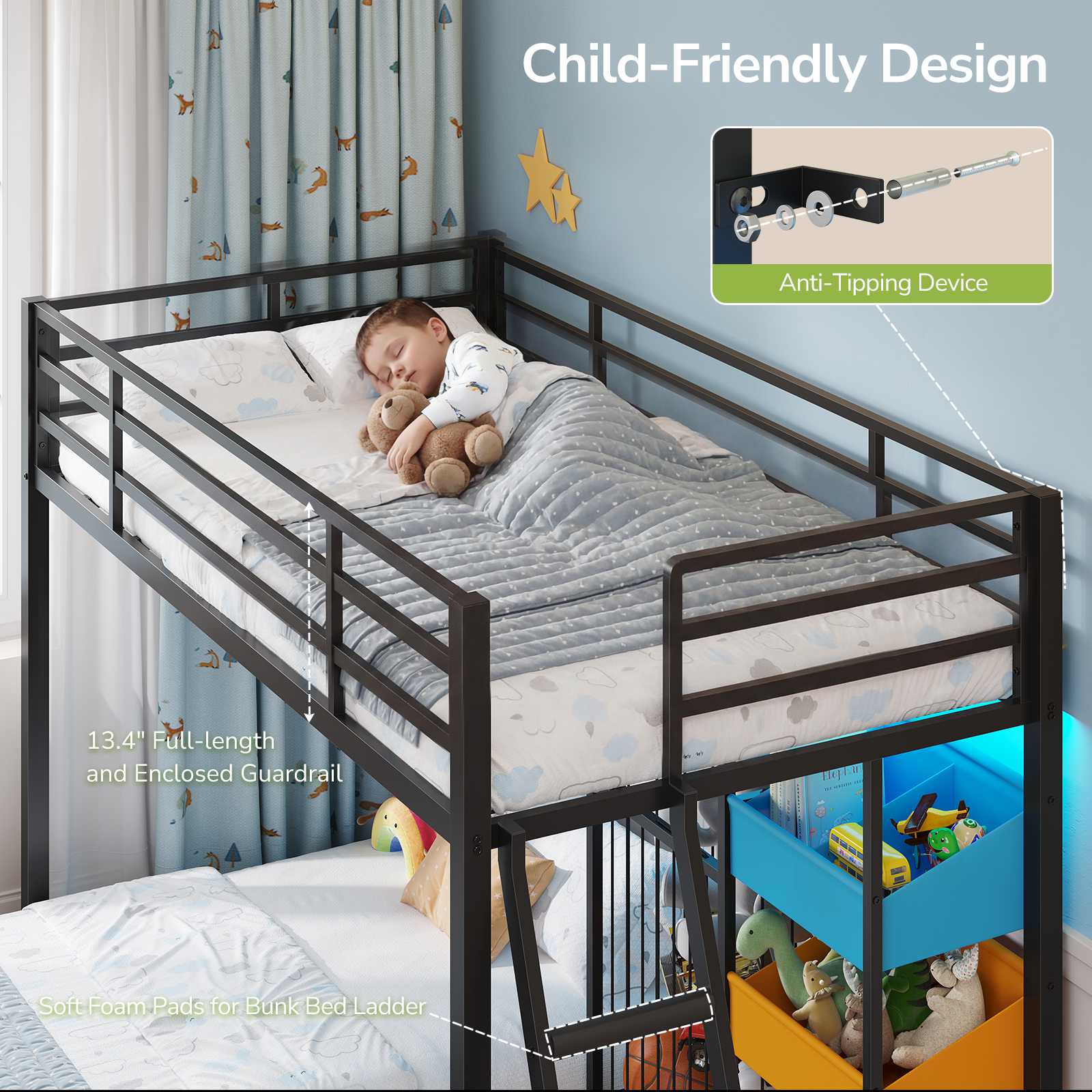 Hasuit | Bunk Bed Twin Over Twin Size with Large Toy Storage Organizer and 3 Bins L Shaped Bunk Beds with LED Lights