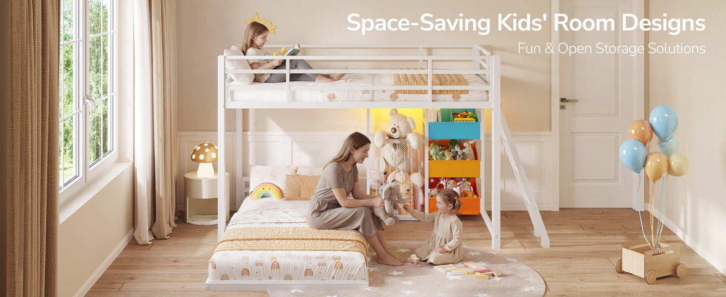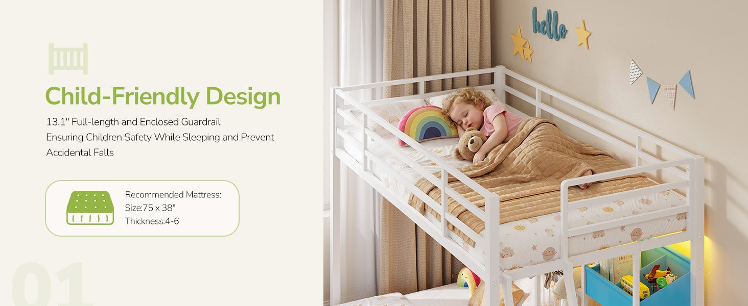 • Age-Appropriate Safety: Upper twin bed with guardrails; lower bunk with floor-level design.