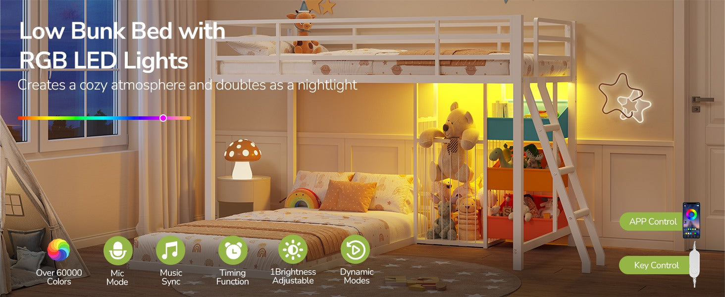 •【Smart RGB LED Lighting】 The low bunk bed with a RGB LED light strip is mounted above the entire storage area, illuminating toys to enhance the play area ambiance. . It can be controlled via a button or an app, offering over 60,000 colors and 29 flash modes. You can freely customize brightness, colors, and modes—including Style, Music, and Mic Mode—and set timers. The LEDs sync to music, creating a warm or magical atmosphere for reading or playtime.
