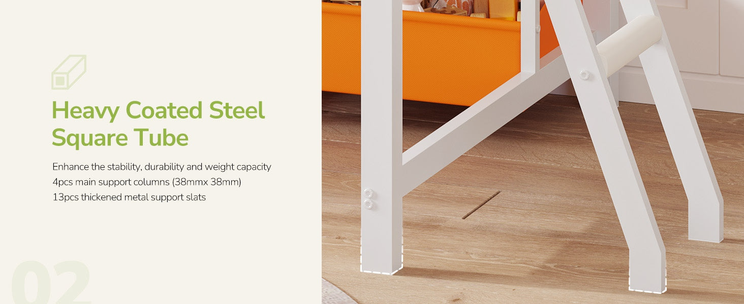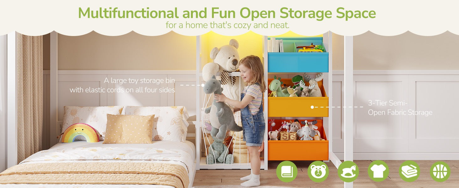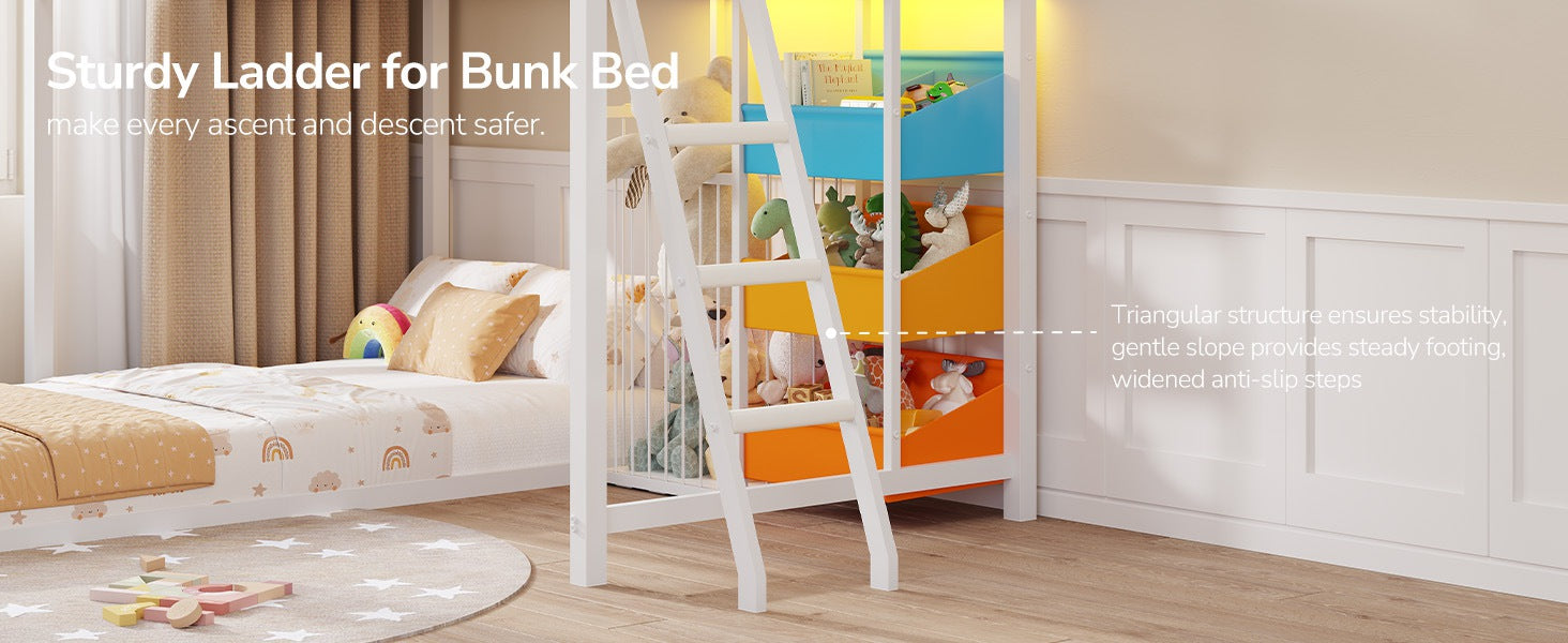 •【All-in-One Toy Storage Solution】 The bunk bed with storage with fun and open storage design. The vibrant three-tone, angled semi-open fabric compartments can hold small toys, building blocks, books, clothes, socks, and more. Storage bins with elastic cord sides allow for vertical stacking of medium to large toys, keeping plush toys visible and making it easy for children to take items out—helping them develop tidy habits effortlessly. This solution maximizes bedroom space while keeping the room clean, organized, and clutter-free.