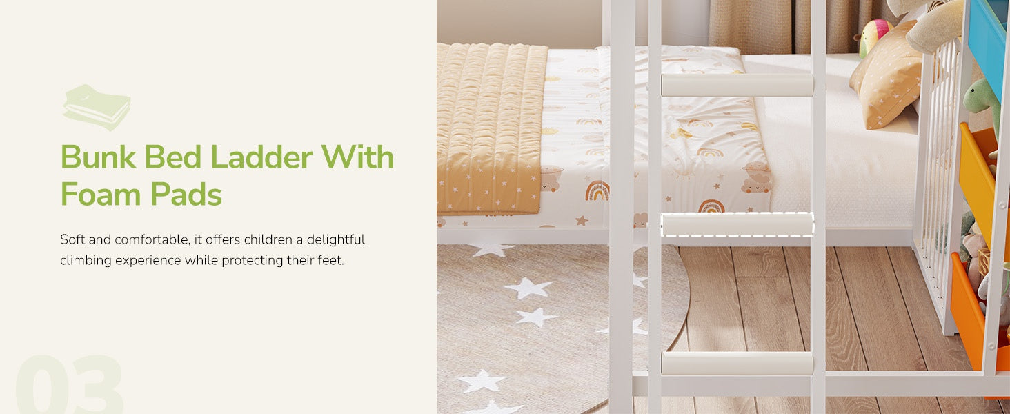 •【Comprehensive Safety-Enhanced Design】 Our twin-over-twin bunk bed is built with a 13.8-inch reinforced full-length guardrail, a customized heavy-duty anti-tip kit, and an extra-sturdy square metal frame to ensure long-term safety and stability. Non-slip floor protectors preserve your floors. The sturdy angled ladder features soft foam-wrapped steps for slip resistance and cushioning, protecting your child while climbing up and down.