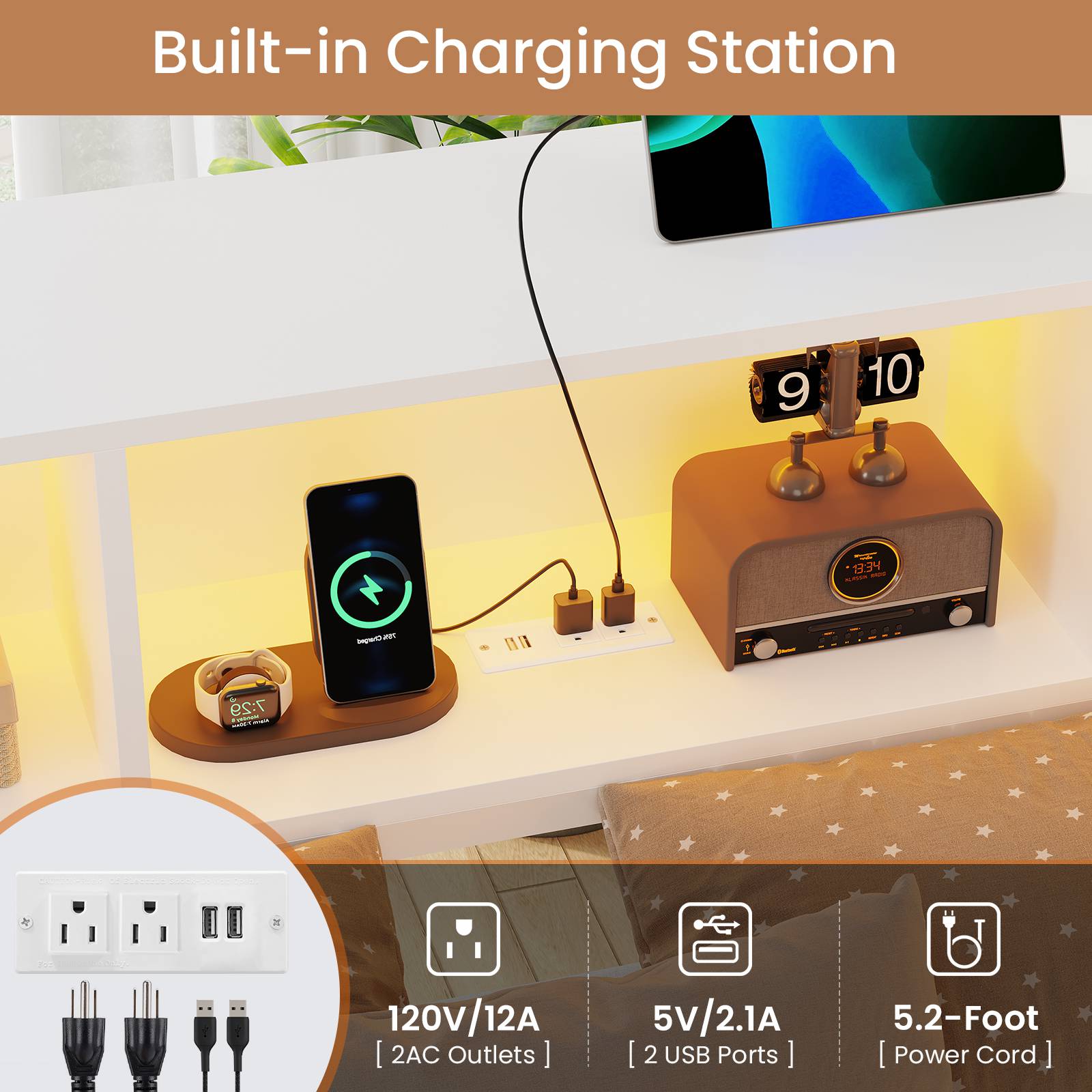 • Charging Station: 2 AC outlets + 2 USB ports for convenient device charging at bedside.