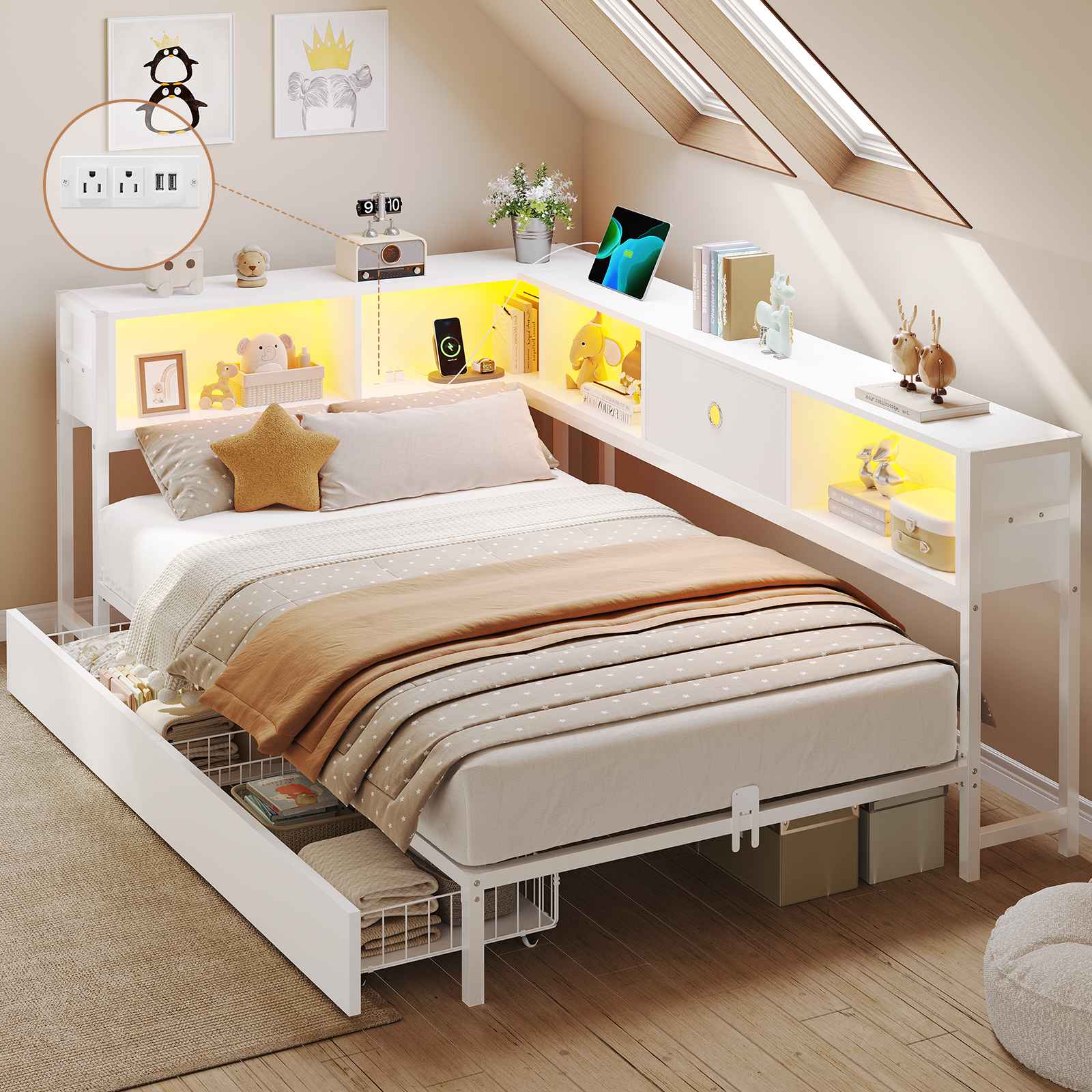 •【Charging Station】 The AC power supply (2 AC outlets + 2 USB ports) is located on the bedside of the twin corner bed with storage, perfect for charging your phone, tablet, or headphones while entertaining in bed without having to get up.