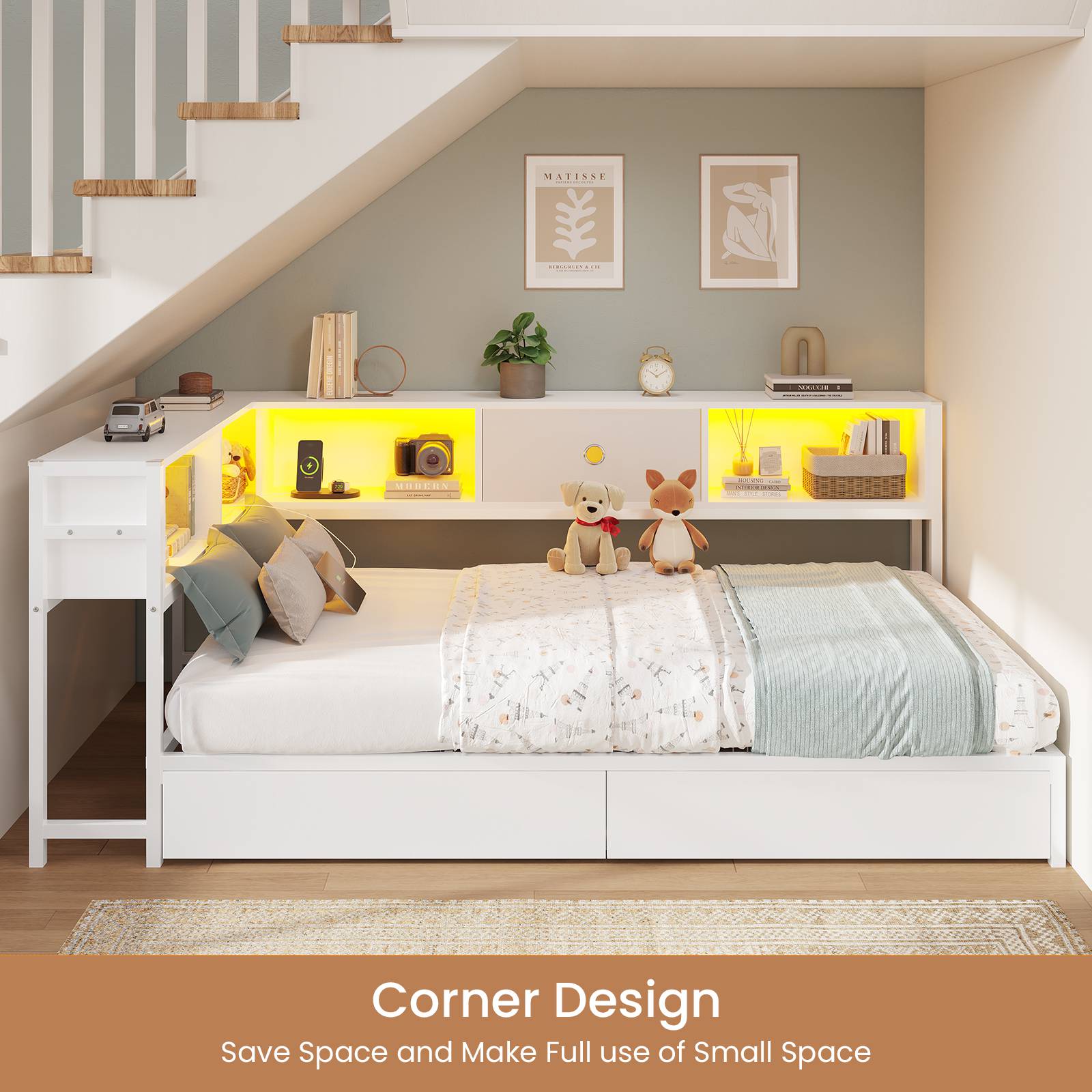 •【Bookcase and Shelves】 The integrated storage headboard and bookcase side rails work wonders for calming clutter, Ideal for avid young readers, this kid's bedroom corner bed unit makes it easy to grab your favorite book from the comfort of your bed.