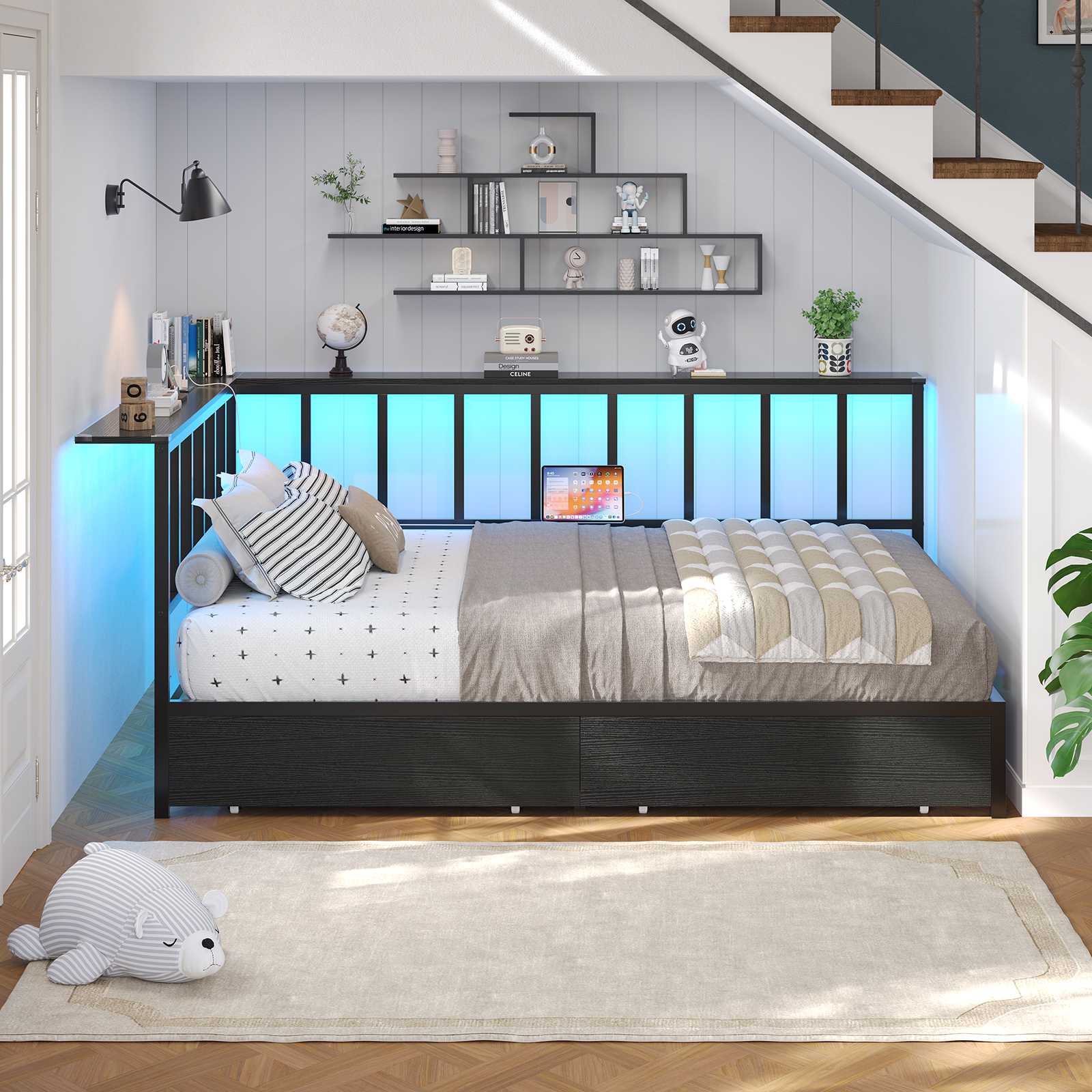 Hasuit | Corner Bed Frame with 2 Storage Drawers Modern Daybed with Charging Station and LED Lights for Kids Teenagers Black Two Sizes