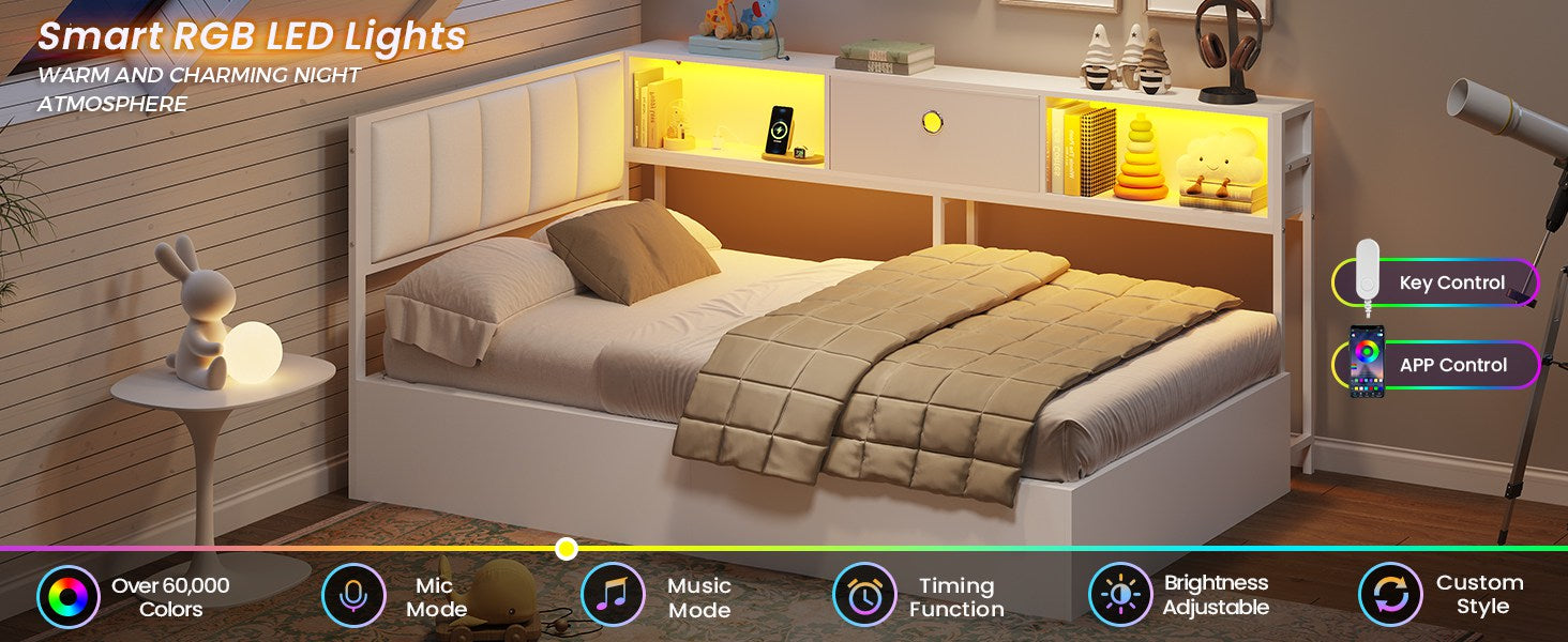 •【Smart RGB LED Lights】The twin size bed frame comes with RGB LED lights. You can control it by button control or mobile app, with more than 60,000 colors of LED lights to choose from. You can freely set custom brightness, colors, modes (as style mode, music mode, microphone mode) and timer function settings that best suits your mood for working or playing games. Synchronize the LED lights with music to create a more romantic bedroom atmosphere.