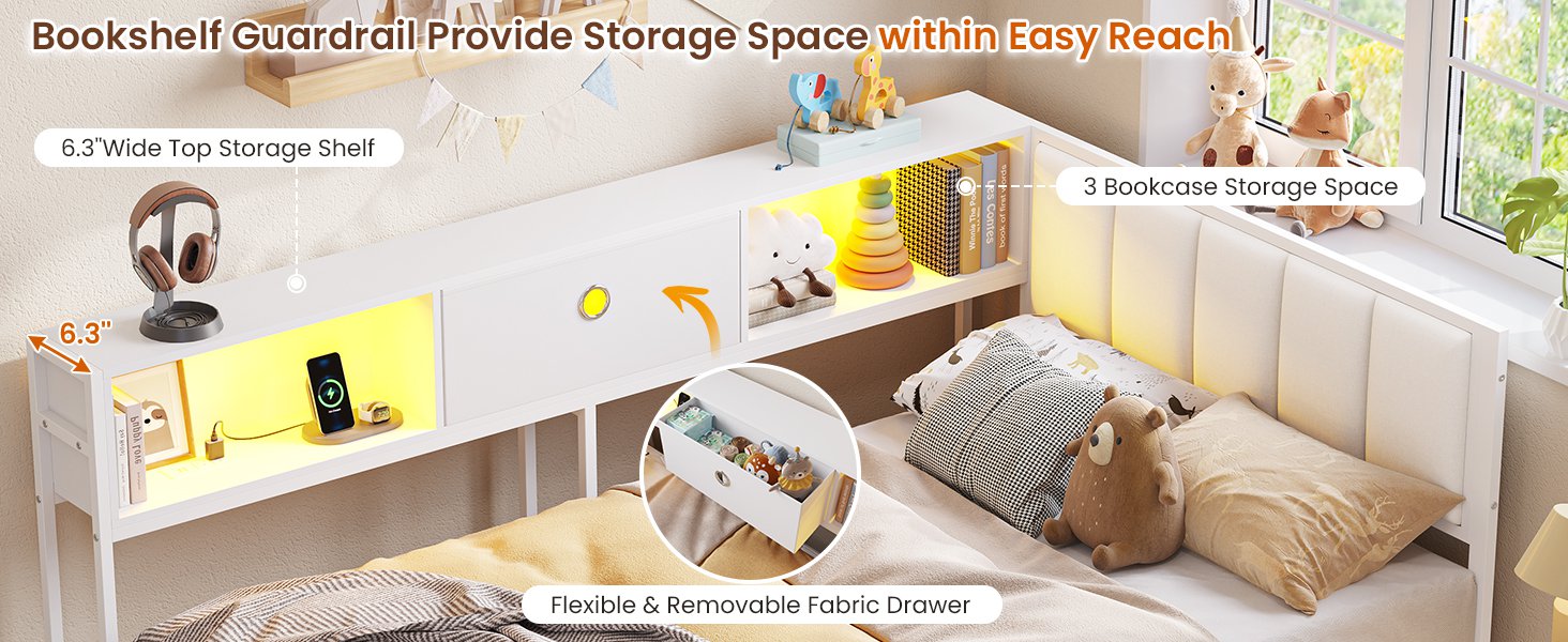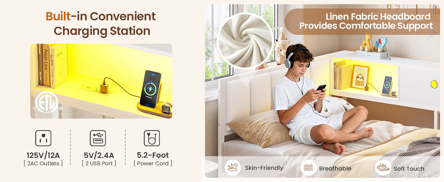•【Convenient Charging Station】This twin daybed with shelves built-in charging station-- 2AC Outlets & 2 USB Port, which can charge your electronic devices at the same time. No need for messy cords or search for available outlets- you can effortlessly charge your lamps, phones or ipads all in one place without the need for extension cords!