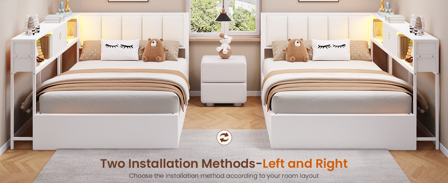 •【Multi-Functional Storage】This twin corner bed frame is specially designed for ultimate practicality.The two bookshelves are for fairy tale books and documents.One flexible and mobile storage box is for toys, socks, etc.The top storage rack is for toys, alarm clocks, glasses, children's books, etc., all within easy reach.Additionally,with its lifting up storage function offers ample under-bed storage space for extra bedding,clothing, shoes, and other items, making it ideal for small bedrooms or apartments where storage space is limited.