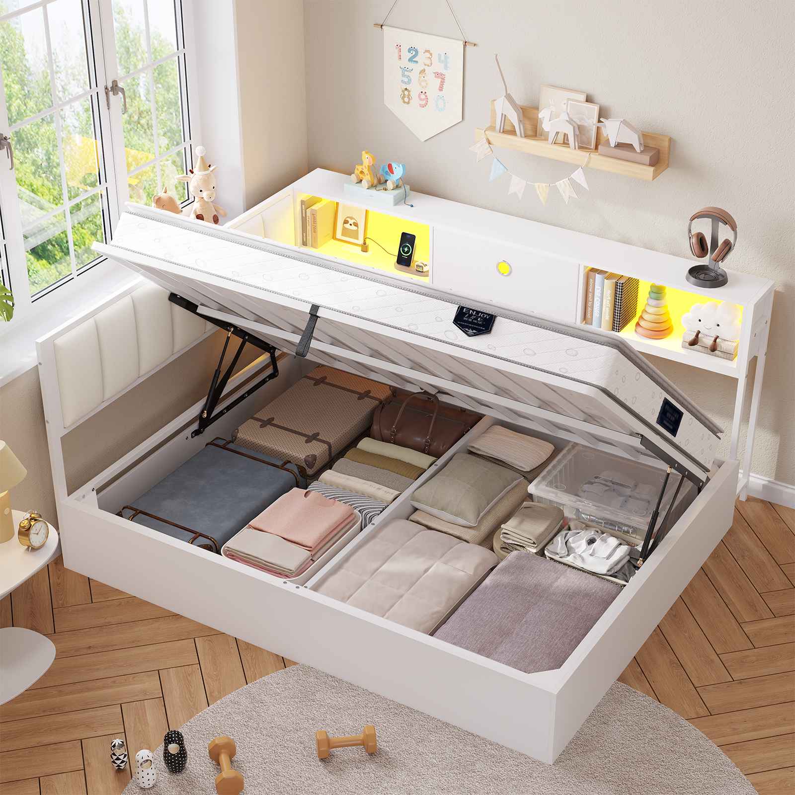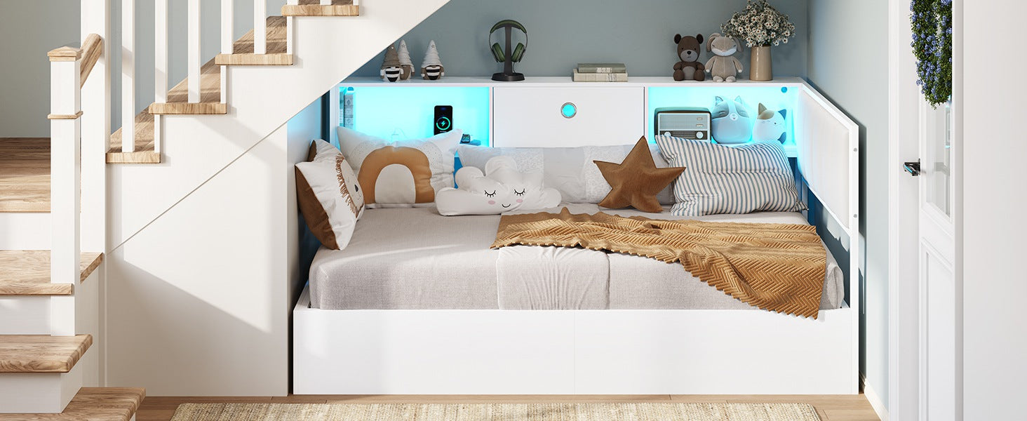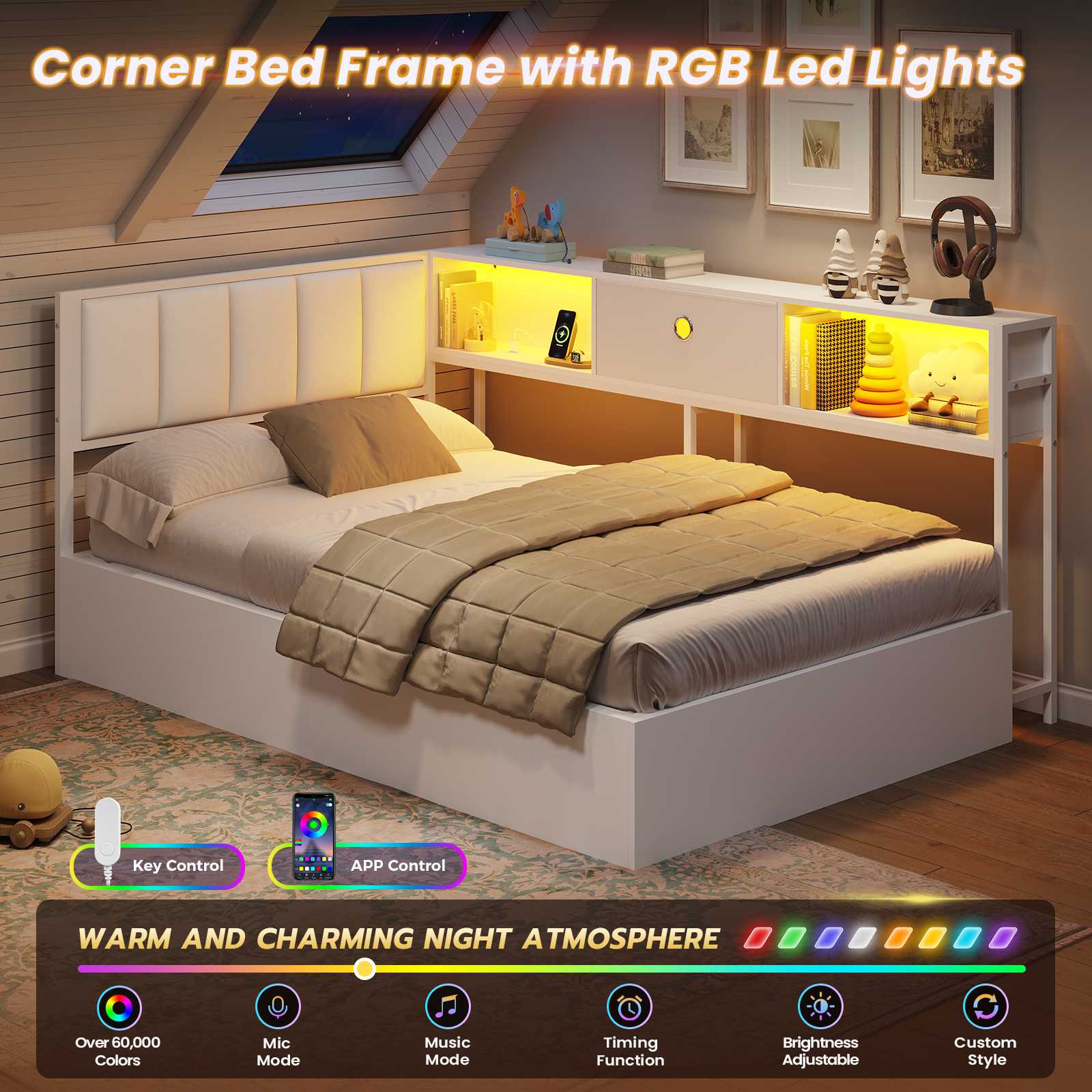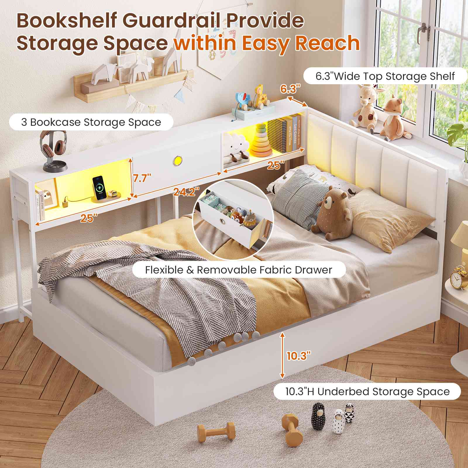 Hasuit | Corner Lift Up Storage Bed Frame with Charging Station & LED Lights Day Bed with Upholstered Headboard and Bookcase for Kids Teens Guests White