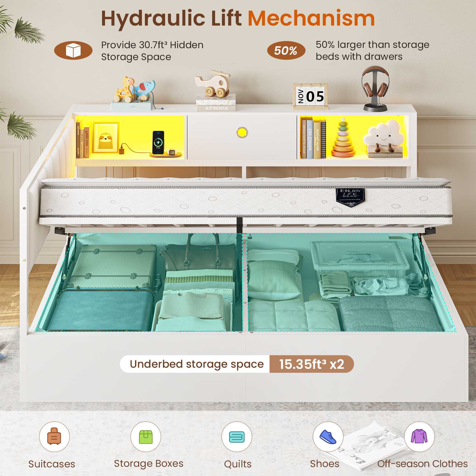 Corner Beds with Hydraulic, Underbed Storage, Lighted, Charging Station, Bookcase and Shelves, Upholstered Headboard, 1 Movable Fabric Storage Bins, Top Storage Shelf