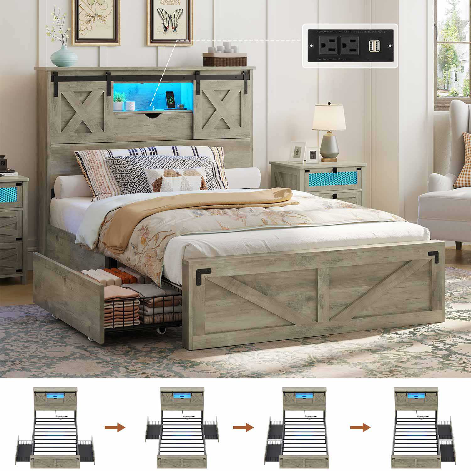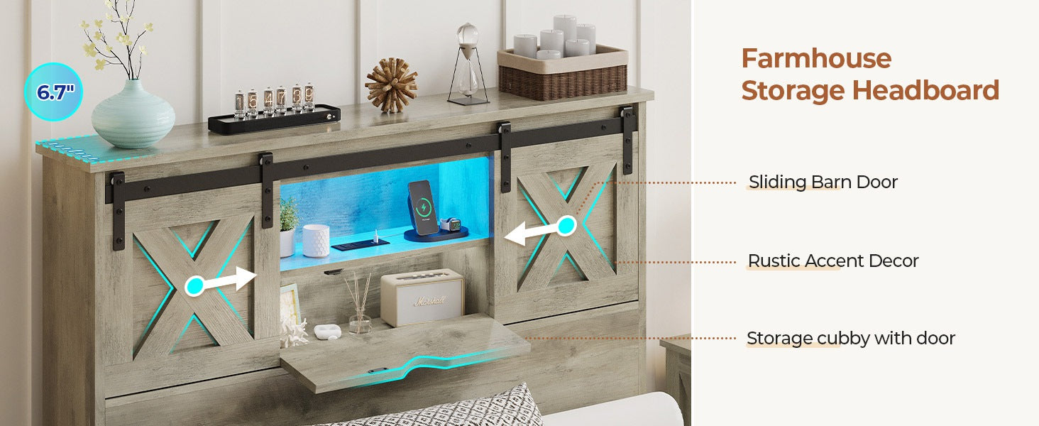 • Storage Headboard: 6.7" display shelf + 2 tier shelves hidden behind sliding barn doors.