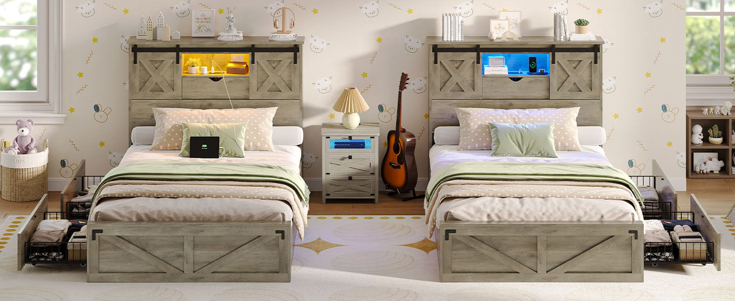 Hasuit | Farmhouse Bed Frame with 2 Storage Drawers Rustic Wooden Platform Twin Bed with LED Lights and Charging Station Rustic Oak