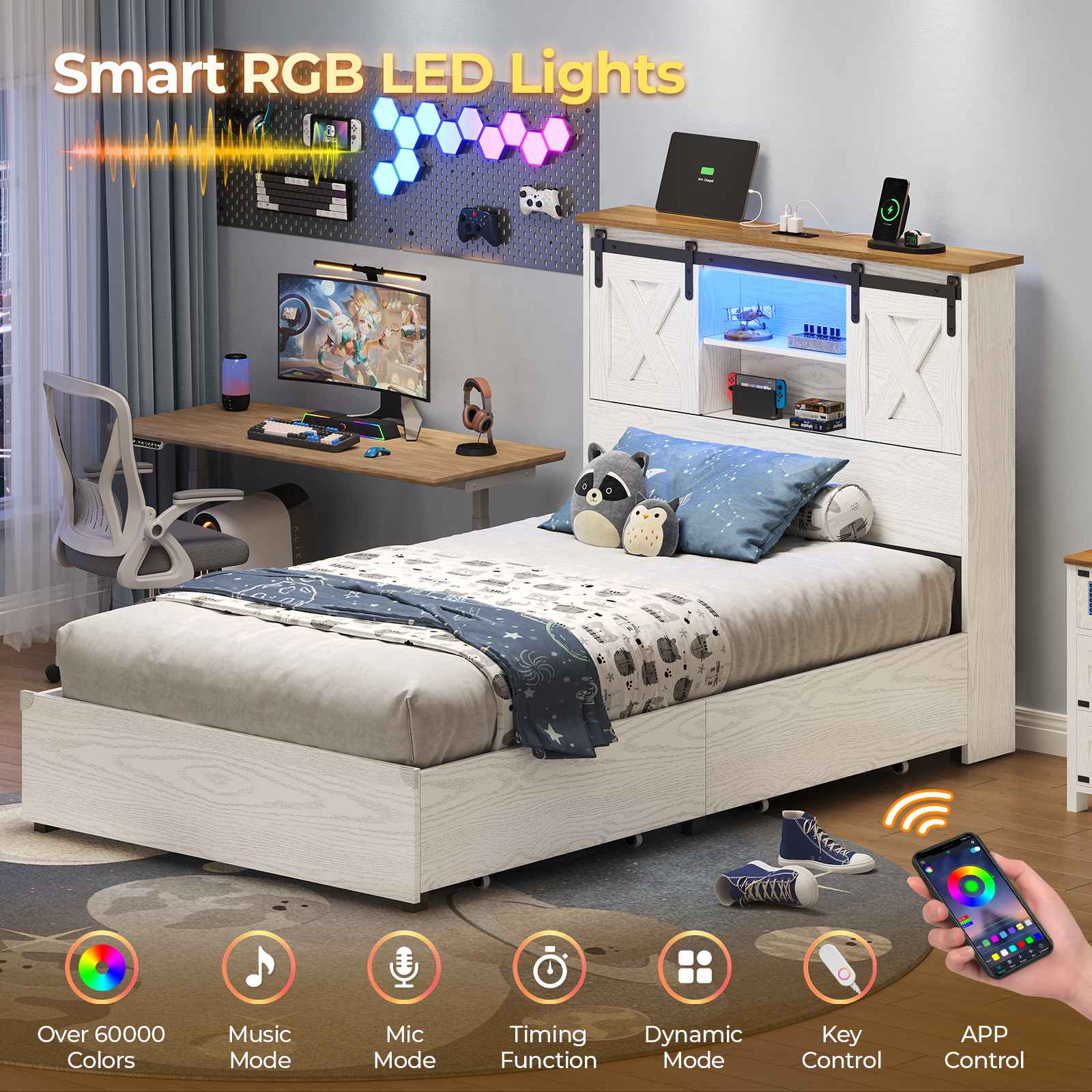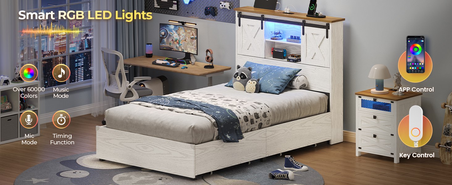 •【MULTIPLE MODES SMART LED LIGHTS】The twin bed frame is equipped with hidden light strips in the headboard storage shelf. The LED light with a variety of colors and light patterns to choose from. You can also adjust the light change by APP or key control, In addition to directly adjusting the light in the APP, you can also set the music, voice, and timing modes, to discover more wonderfully!