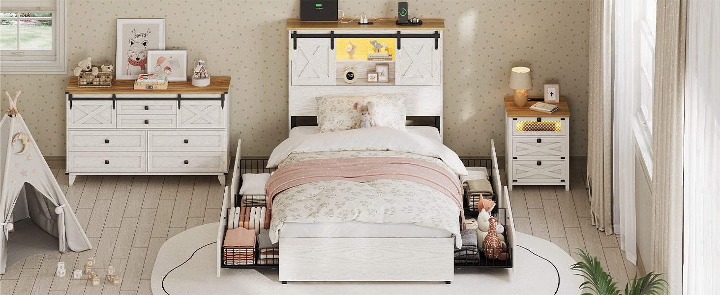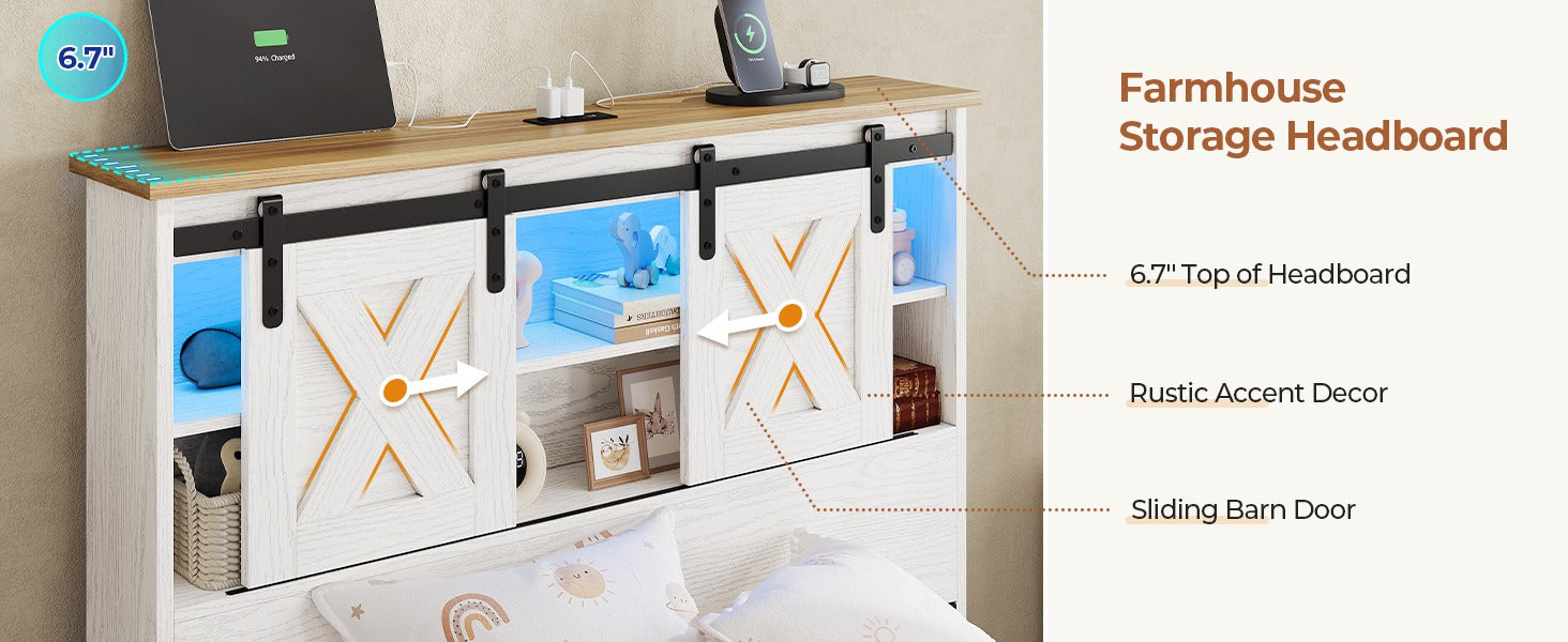 • Storage Headboard: 6.7" display shelf + 2 tier shelves hidden behind sliding barn doors.