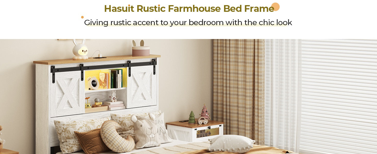 Charging Station, Farmhouse Decor, LED Lighting, Storage Headboard with Sliding Barn Door