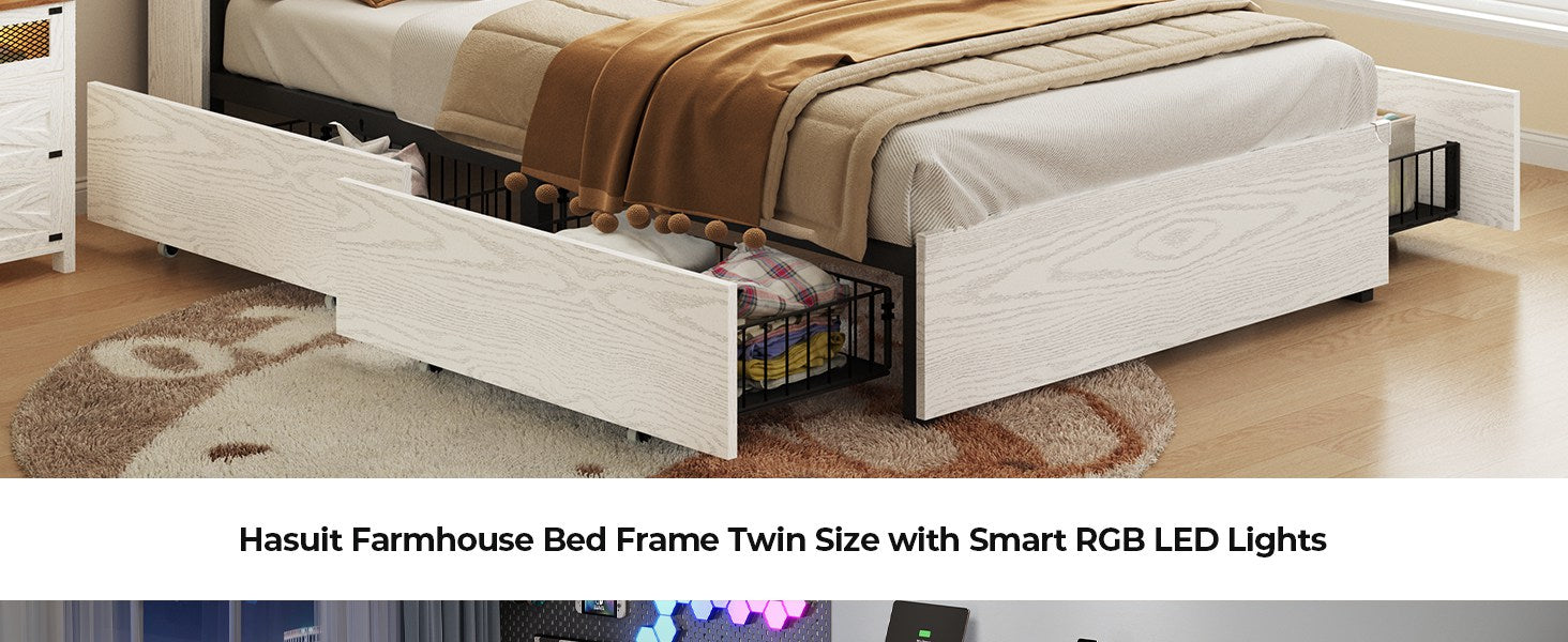 Hasuit | Farmhouse Bed Frame with 4 Storage Drawers Wooden Platform Rustic Beds with Charging Station and LED Lights White