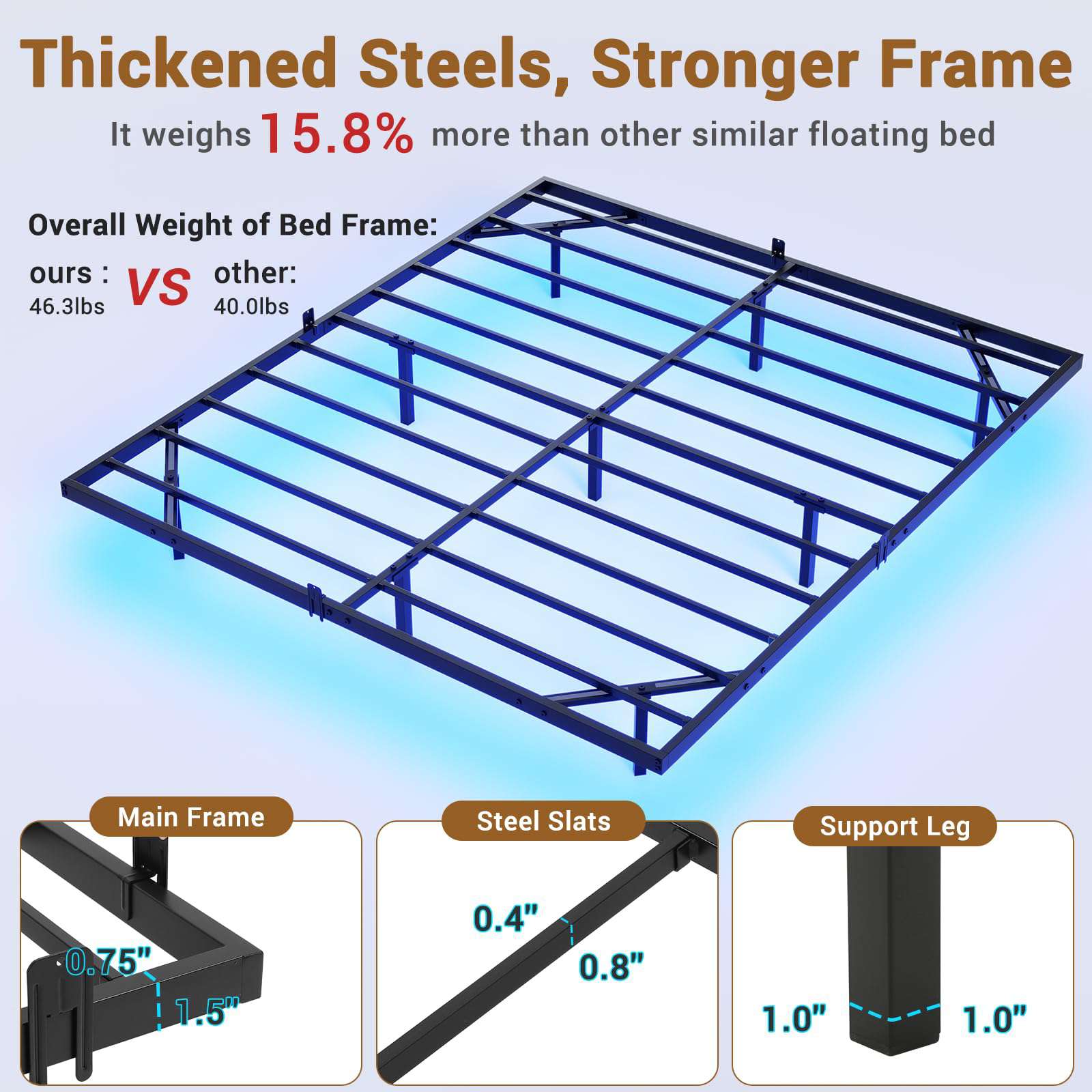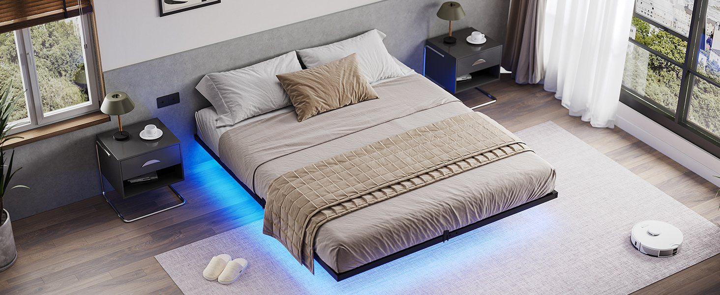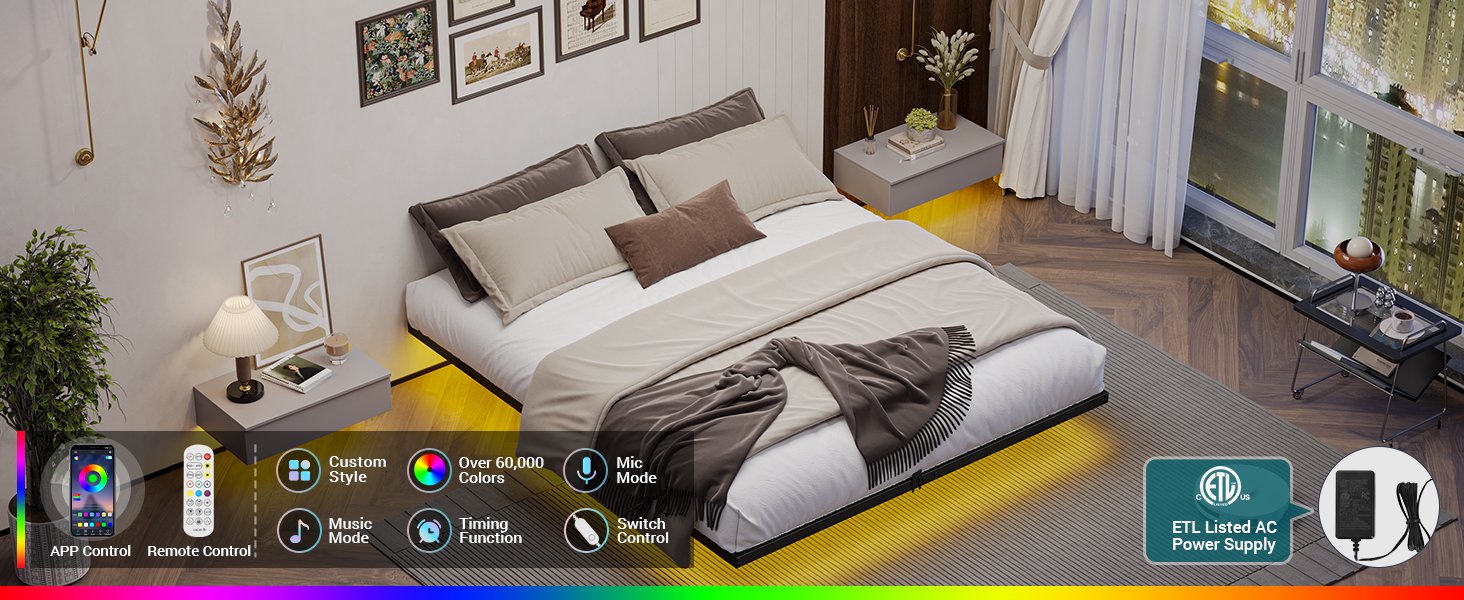 •【Modern Floating Bed Frame】 The floating bed frame is supported by inside legs on the reinforced main frame, which provides adequate stabilizing support while still making the bed appear to be floating in mid-air. Combined with the three side light strips under the bed, gives it a more modern feel.