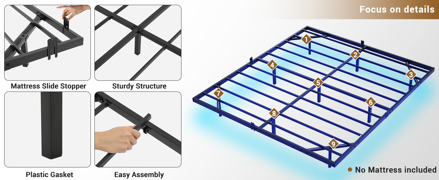 •【Mattress Slide Stopper】Each metal platform bed frame comes with 4 mattress slide stoppers. Simply press it onto the mounted metal bed frame, made of high-quality material for durability, no screws are required, customized for a perfect fit, and prevents any unwanted movement or sliding of the mattress.