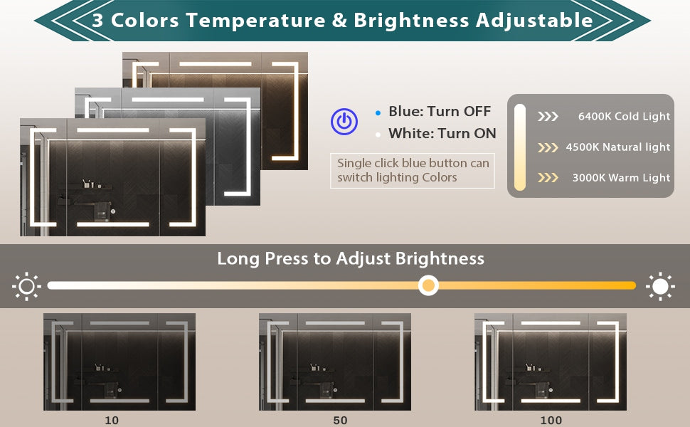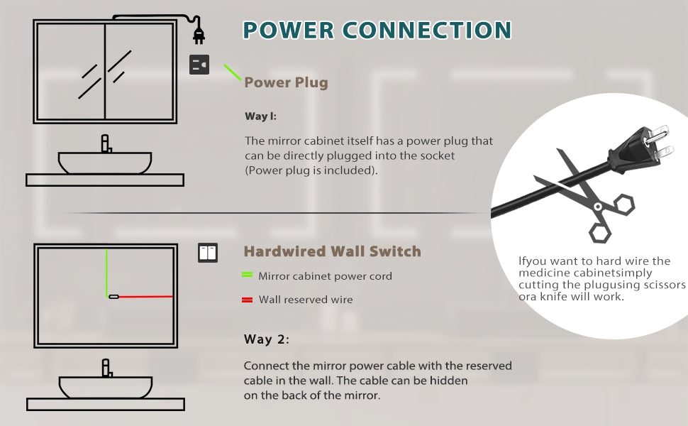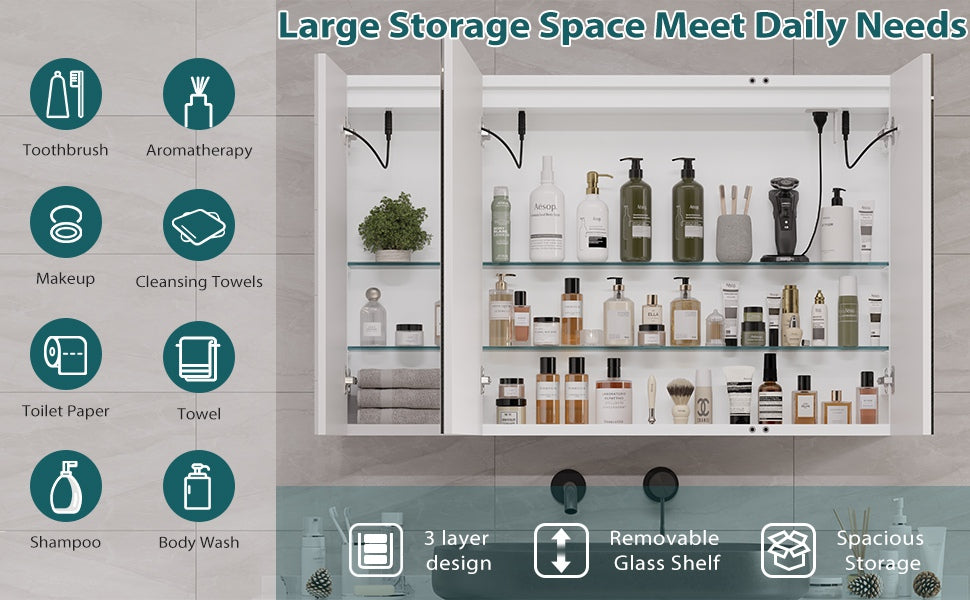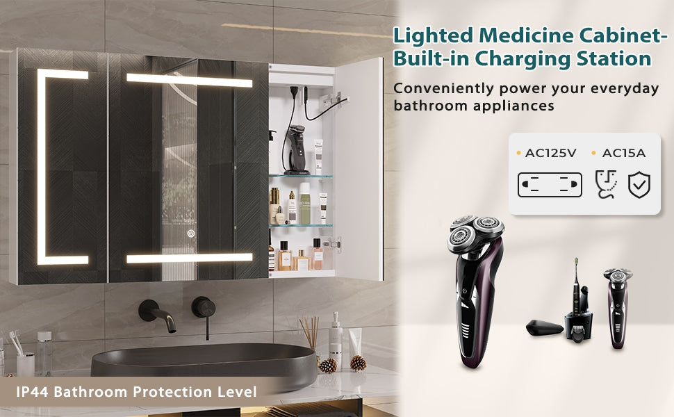 •【Built-in Outlet】The medicine cabinet has a built-in A/C 125V 15A outlet, which can meet your needs for using almost any bathroom appliance. Conveniently power your everyday bathroom appliances, such as electric toothbrushes, razors, beauty devices, and hairdryers.