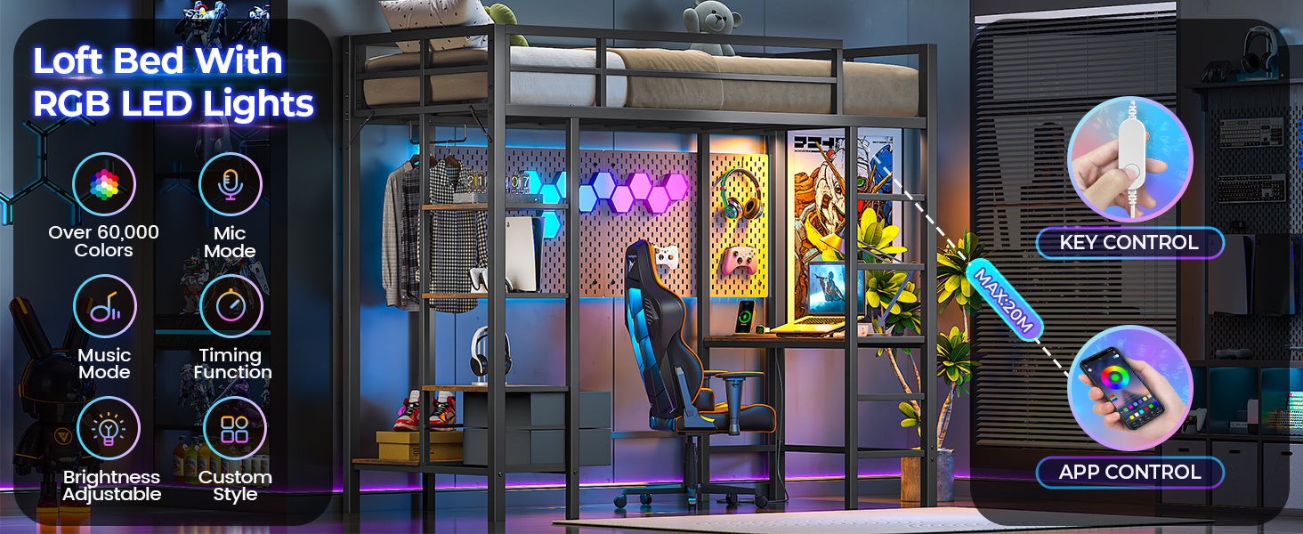 •【Smart RGB LED Lights】This innovative loft bed twin size comes with RGB LED lights on the right side, allowing you to create a dreamy and colorful bedroom atmosphere for your child. The RGB light color can be easily adjusted by pressing the key, and you can access more functions such as mic, music, and timing mode through the convenient APP application. With this twin loft bed, your child can enjoy a comfortable and stylish sleeping space while also adding a touch of fun and creativity to their room.