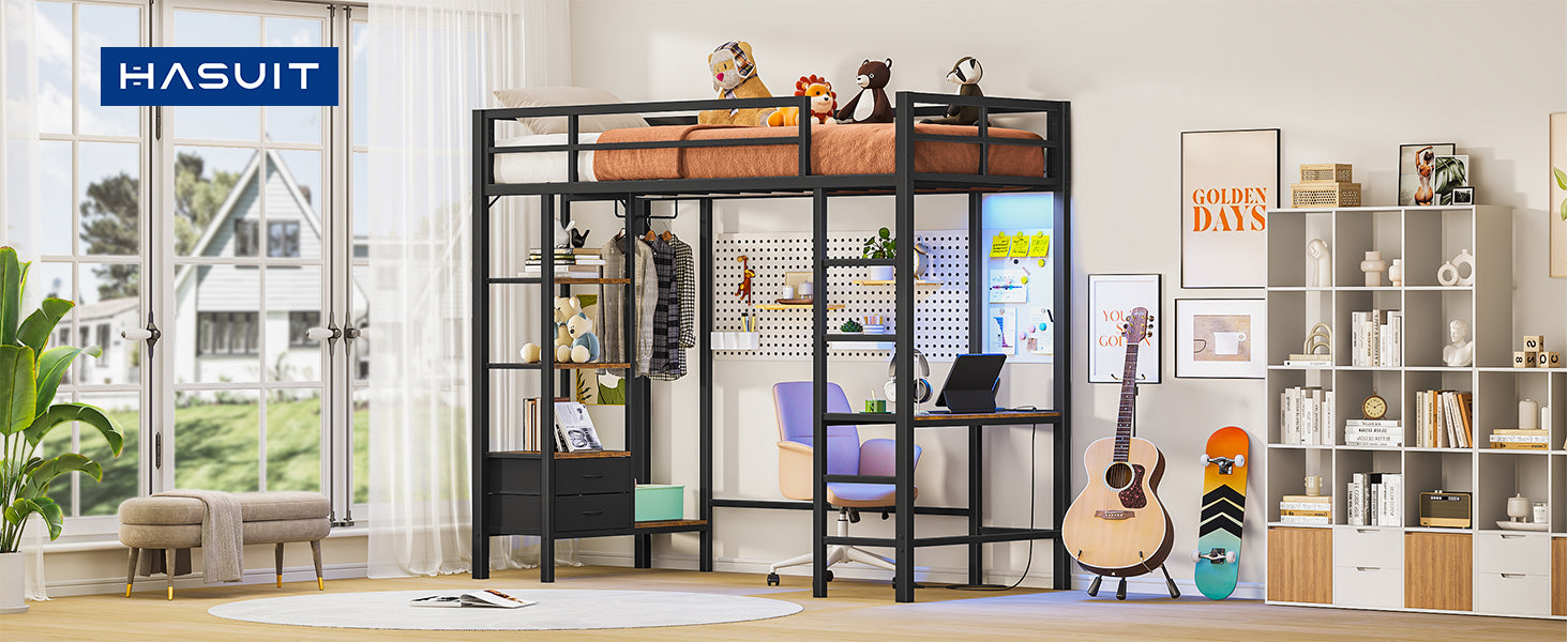 •【Twin Loft Bed with Desk】Introducing the Hasuit Twin Size Loft Bed with Desk and Charging Station, a versatile and practical solution for creating a productive and space-saving area for your child. This loft bed can be configured as two separate spaces, providing a space under the top bunk for work or leisure, while still offering a comfortable sleeping area.