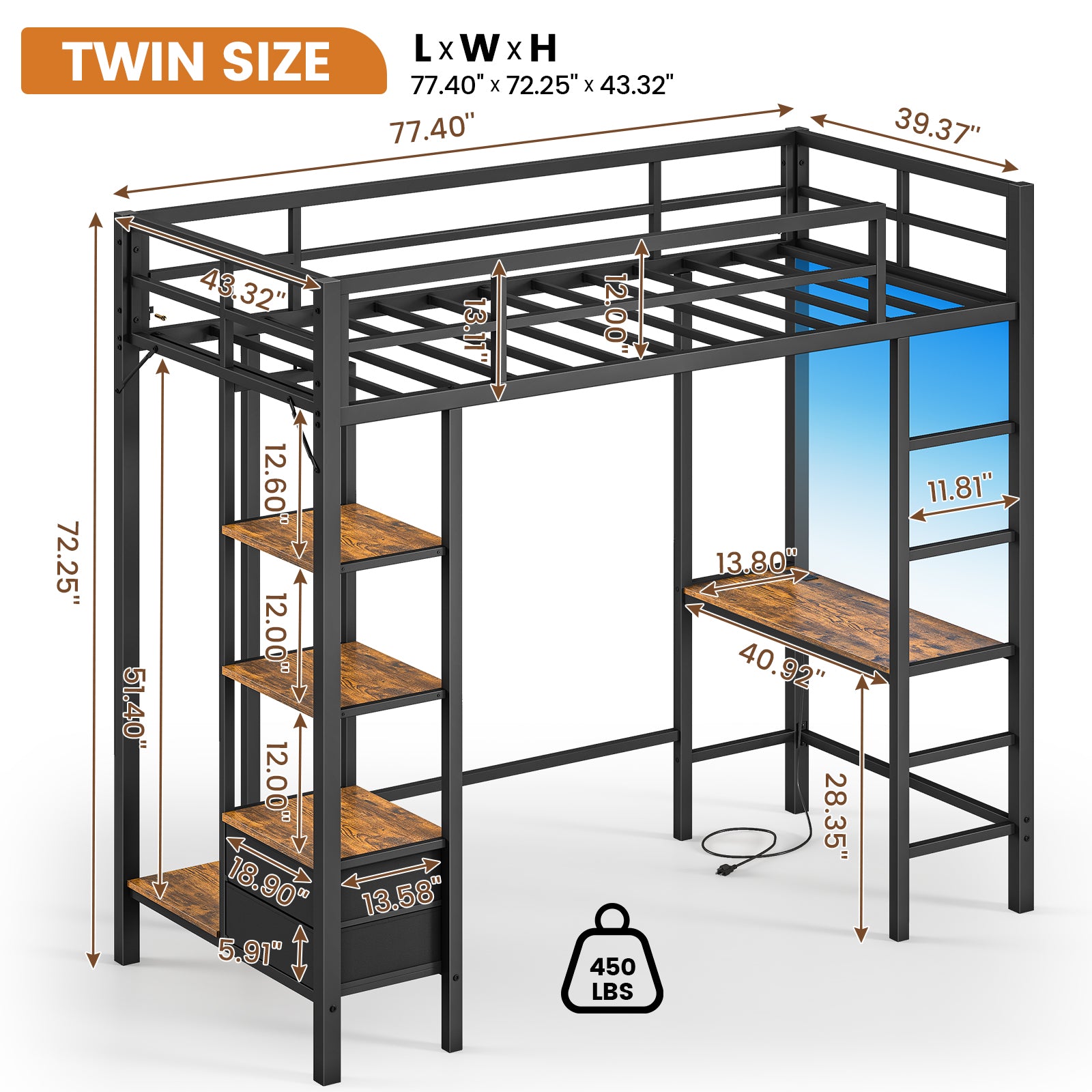 Hasuit | Loft Bed Twin Size with Desk and Charging Station Metal Twin Loft Bed with LED Lights 4 Storage Shelves and Safety Guard