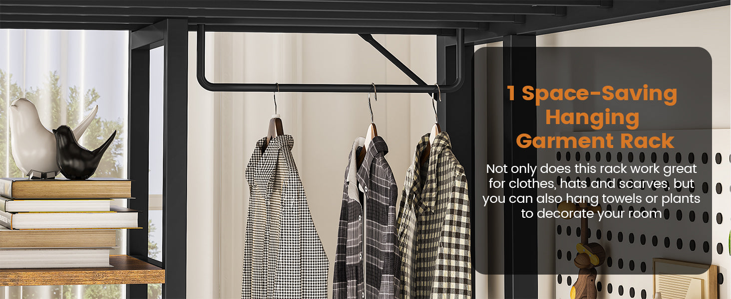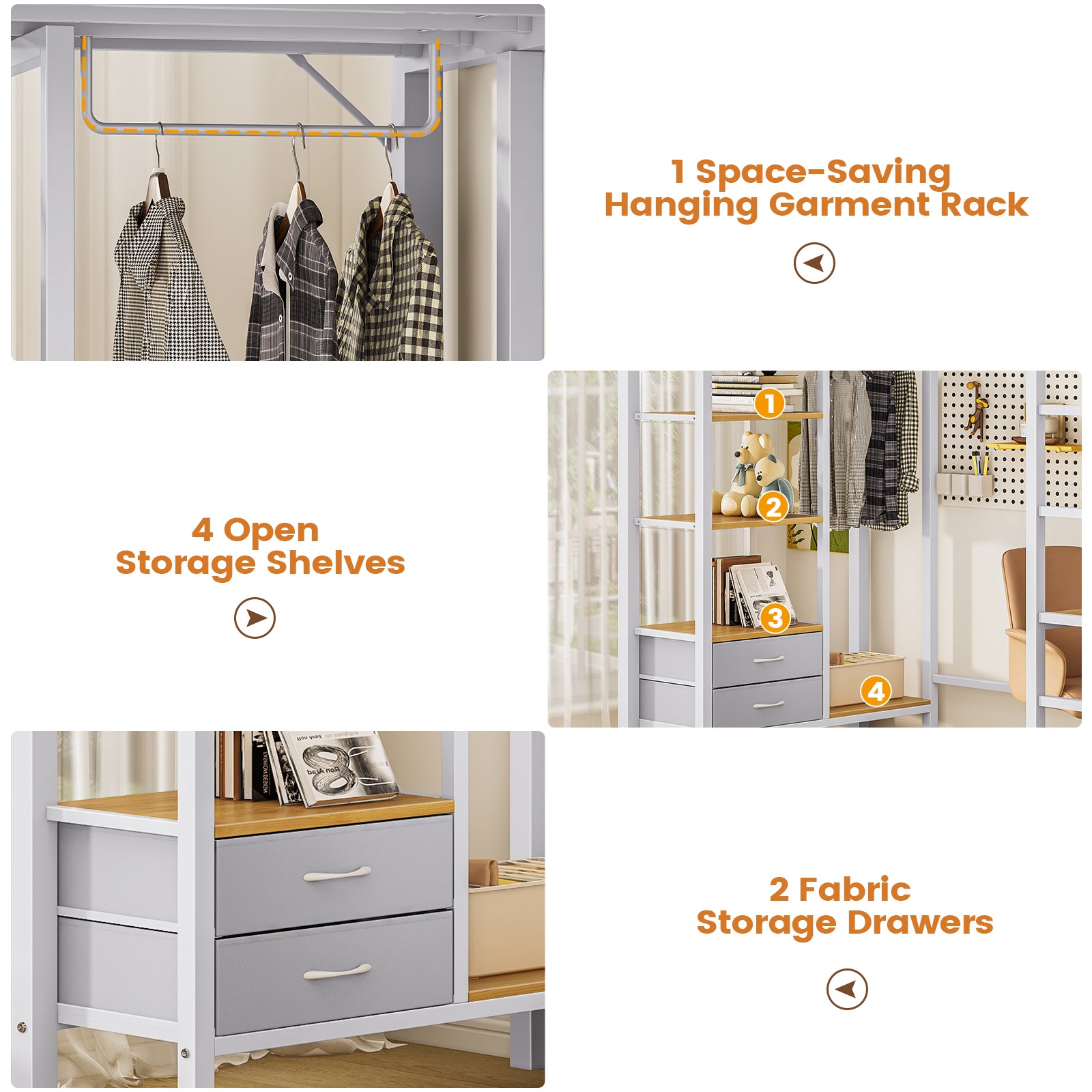 • Ample Storage: 4 shelves, 2 drawers, and hanging rail keep room organized.