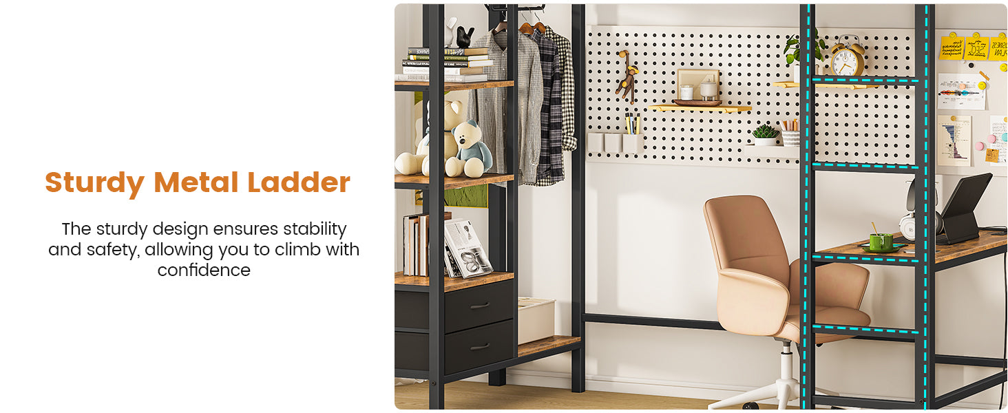 •【Multifunctional Storage Design】This twin size loft bed comes with ample storage space underneath, featuring 4 open storage shelves that can hold your books, files, home printer, photos, or other items. Additionally, 2 fabric drawers provide a convenient place to store your underwear, socks, and other small items. The twin loft bed with desk also includes a hanging rail on the left corner, perfect for hanging up clothes and hangers. Say goodbye to clutter and hello to practical storage with the twin metal loft bed.