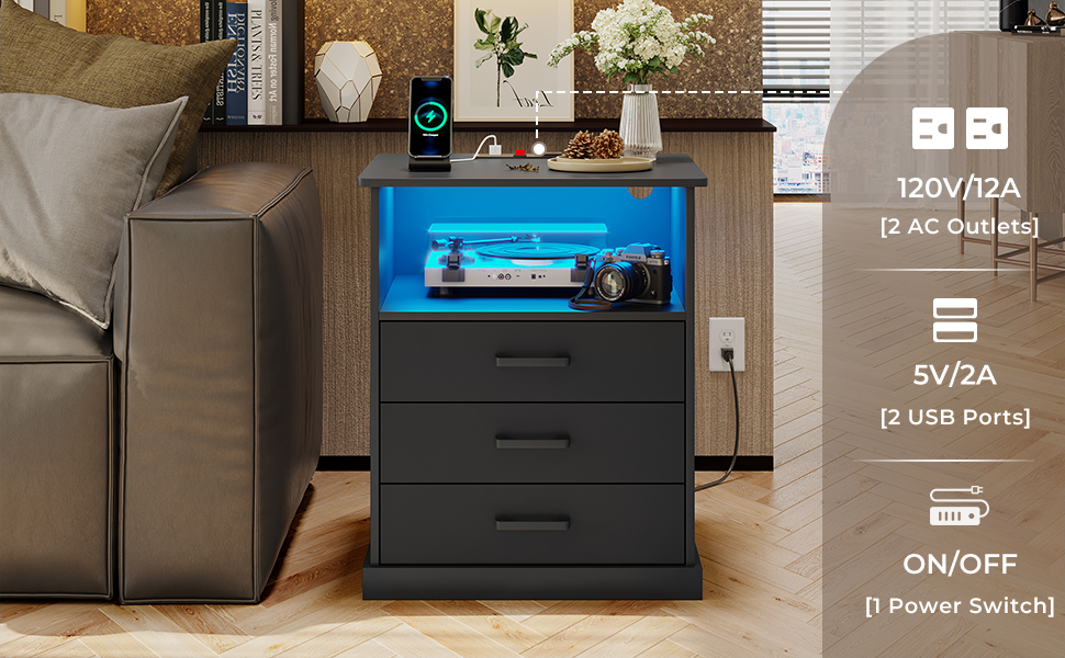 Hasuit Nightstands with Charging Station and LED Lights