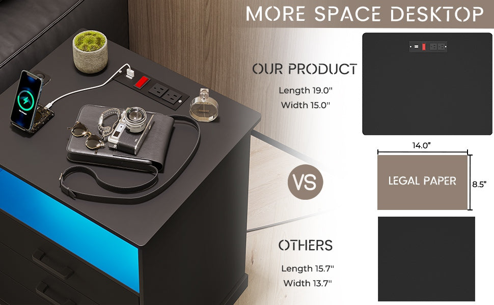 Hasuit | Nightstand with Charging Station and LED Lights Large Bedside Table with 3 Storage Drawer Wider Tabletop