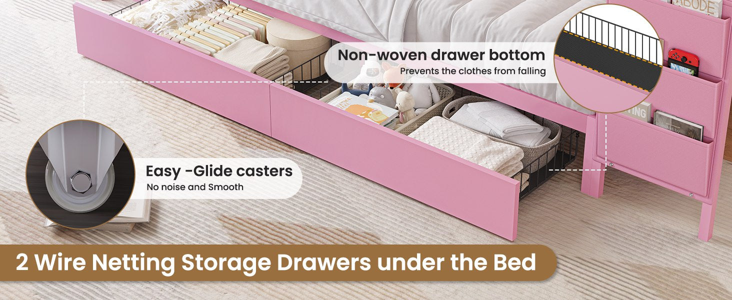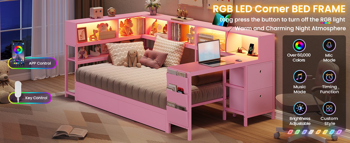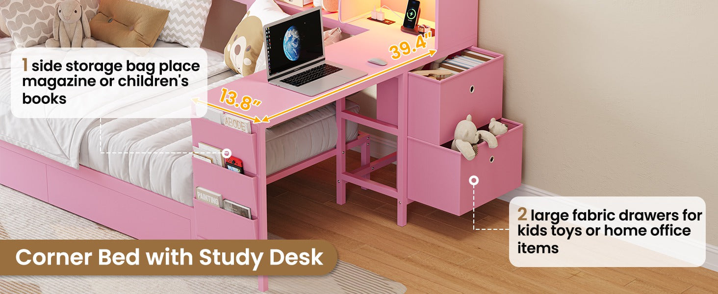 •【Corner Bed with Desk】This charming modern pink bed frametransforms any small space - with a desk at the foot of the bed, combining a cozy sleeping area and a practical workspace. Whether you need a desk for work, study or playing games, this versatile twin bed with desk offers the nice solution. Perfect for teen rooms, dorms, studios or apartments.