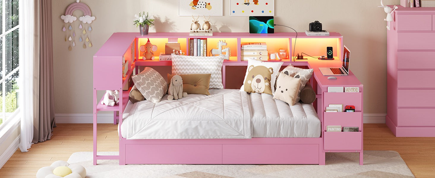 Hasuit | Twin Corner Bed with Desk and Storage Bookcase Daybed with Charging Station and LED Light Modern Teenagers Bedframe