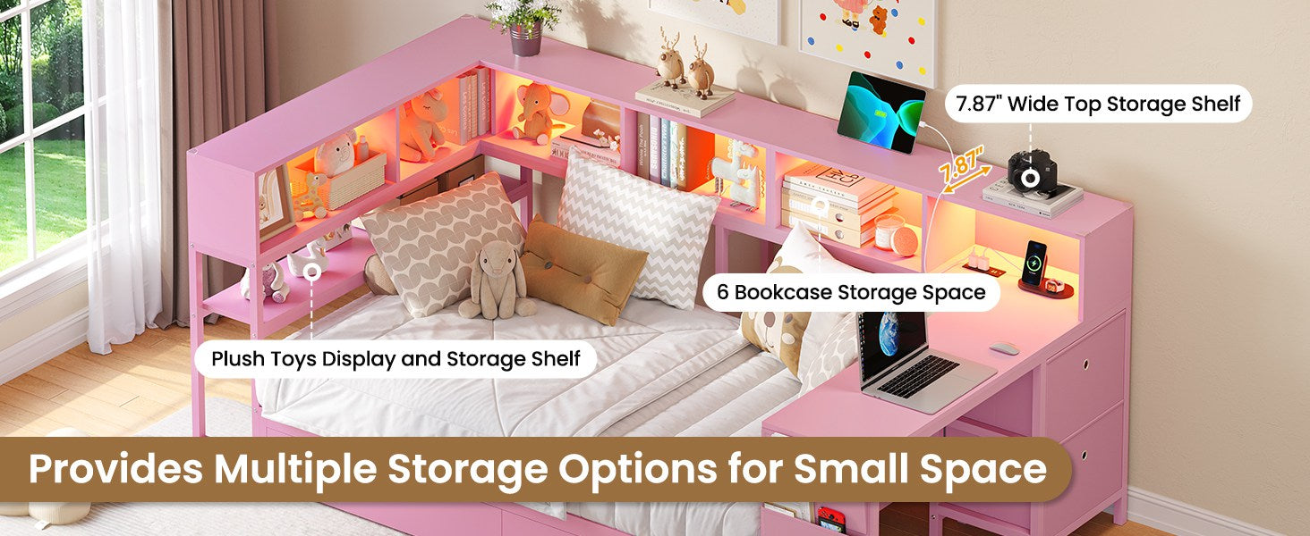 •【 Multi-Functional Storage 】This innovative corner bed frame is designed for ultimate practicality, featuring 6 built-in bookshelves perfect for books, magazines, and files. 2 under-bed drawers plus 2 versatile fabric bins for clothes, shoes, and blankets. The 2-tier headboard shelves and top storage ledge keep toys, alarm clocks, and glasses within easy reach. 3 side organizer pockets neatly hold magazines, remotes, storybooks. Maximize the bedroom space and keep the room clean and tidy. The wooden of open shelves, drawers, and desk are FSC-certified.