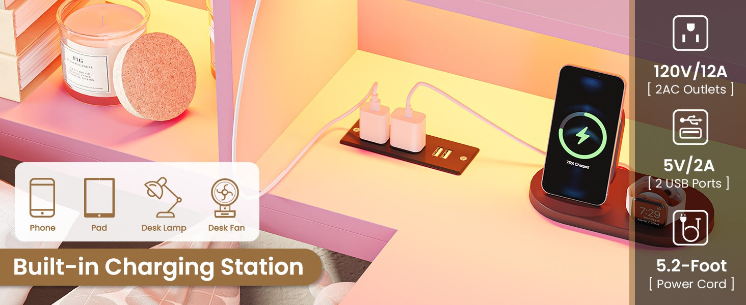 • Charging Station: 2 AC outlets + 2 USB ports for convenient device charging.